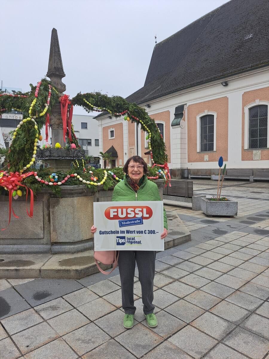 Die Grieskirchnerin Gitta Haberfellner war gerade in ihrer Heimatstadt zu einem Schaufensterbummel unterwegs, als sie auf den Kirchenplatz vom Tips-Glücksengerl überrascht wurde. Auf die Frage nach ihrer Lieblingszeitung antwortete sie ohne zu zögern mit „Tips“ und durfte sich somit über einen 300-Euro-Gutschein der Fussl-Modestraße vom Tips-Glücksengerl freuen. An der Tips gefällt ihr, dass sie so regional ist und man erfährt, was los ist. Mit ihrem Gewinn wird sie mit ihren Enkeln einen Oster-Einkauf machen.