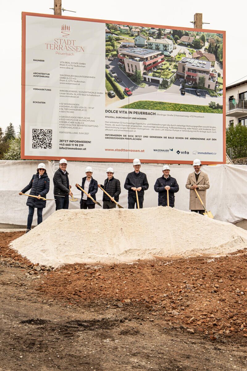 Die terrassenförmige Bauweise setzt nicht nur optische Akzente, sondern schafft auch großzügige Freiflächen in Form von Balkonen, Loggien und Eigengärten. Bürgermeister Roland Schauer freut sich über die Entwicklung: „Mit den Stadtterrassen entsteht ein modernes Wohnprojekt, das perfekt zur Weiterentwicklung unserer Stadt passt. Es verbindet Lebensqualität, Nachhaltigkeit und eine attraktive Lage im Zentrum. Ein echter Gewinn für Peuerbach.“ Die Fertigstellung soll im Frühjahr 2027 sein, wie Bauträger Nicola Vitale von der VITA REAL ESTATE GmbH erklärt.