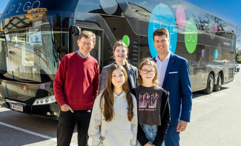 Die Besucher des FLiP2Go durchlaufen sieben interaktiv-multimediale Spielstationen, die von Konsumentscheidungen, Haushaltsbudget, Angebot und Nachfrage, bis hin zu Gefahren durch Verschuldung reichen. „Wenn die Jugendlichen hochkonzentriert an den Touchscreens sitzen und sich mit dem Thema Finanzen auseinandersetzen, zeigt sich, dass finanzielle Allgemeinbildung alles andere als langweilig ist“, sagt der Regionaldirektor der Sparkasse Oberösterreichs Gerald Klinger. Der FLiP2Go richtet sein Angebot an zwei Zielgruppen: Für Kinder von zehn bis 14 Jahren und Jugendliche von 15 bis 17 Jahren. Aber auch Erwachsene sind eingeladen, ihr Finanzwissen auszubauen. Bis zu 32 Spieler können die Spielrunde auf den zwei Ebenen des Busses gleichzeitig absolvieren.