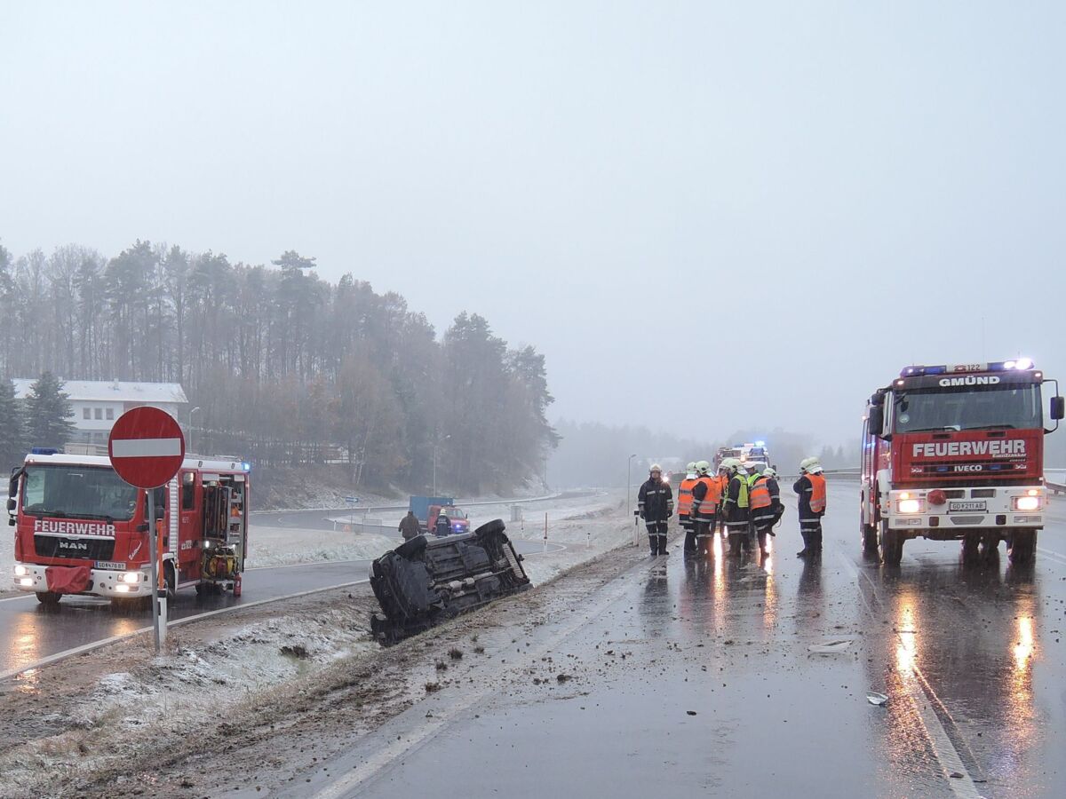 Der Lenker eines Hyundai Tucson verlor im Bereich des „Knoten Hoheneich“ die Kontrolle über sein Fahrzeug, schlitterte über alle vier Spuren (zwei in Fahrtrichtung Gmünd, zwei in Fahrtrichtung Schrems) der Bundesstraße und landete seitlich liegend im Straßengraben. Da eine Person erst im Gurt hing und das Fahrzeug nicht verlassen konnte, wurde für die Feuerwehr Alarmstufe „T2“ ausgelöst und somit zu einem Verkehrsunfall mit einer eingeklemmten Person alarmiert.