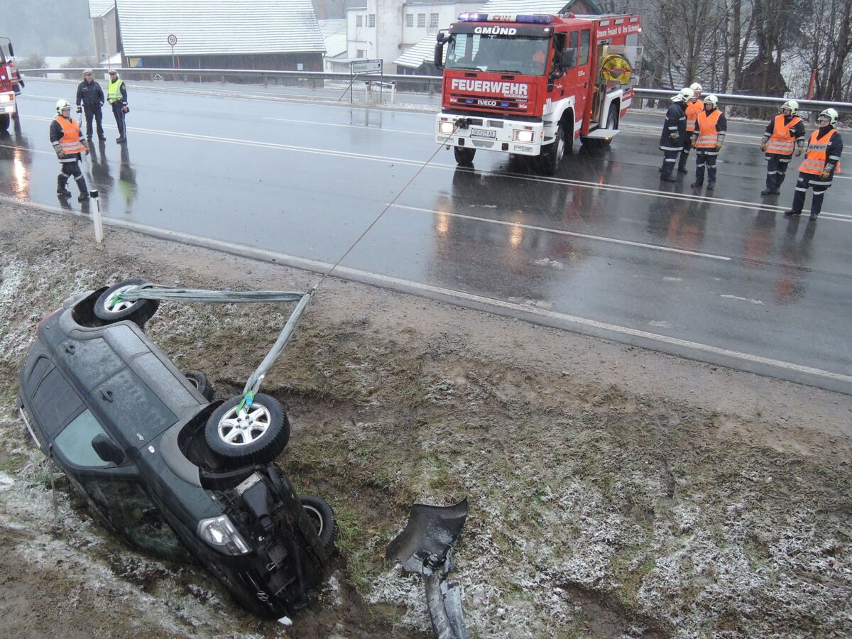 Noch vor dem Eintreffen der örtlichen Feuerwehr konnte sich der eingeschlossene Lenker aus dem Gurt befreien, aufgrund der Lage des Fahrzeuges dieses jedoch nicht verlassen. Die Freiwillige Feuerwehr Hoheneich sicherte gemeinsam mit der Freiwilligen Feuerwehr Gmünd das Unfallfahrzeug ab und half dem nahezu unverletzten Fahrer aus dem Wrack. Dieser wurde vom Roten Kreuz zur Kontrolle in das Krankenhaus Gmünd gebracht. Durch Einsatz von zwei Seilwinden konnte das Fahrzeug im Anschluss aus dem Graben geborgen und gesichert abgestellt werden. Für die Dauer des Einsatzes wurde die B41 teilweise gesperrt.