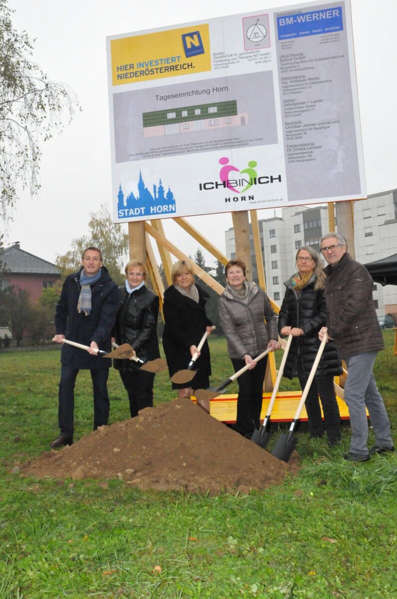 HORN. Unter der Anwesenheit von Sozial-Landesrätin Barbara Schwarz (ÖVP) und Landtagsabgeordneter Bürgermeister Jürgen Maier (ÖVP) fand heute Morgen bei klirrender Kälte der symbolische Spatenstich für ein wahres „Leuchtturm-Projekt“ (Zitat Landesrätin Schwarz) statt.