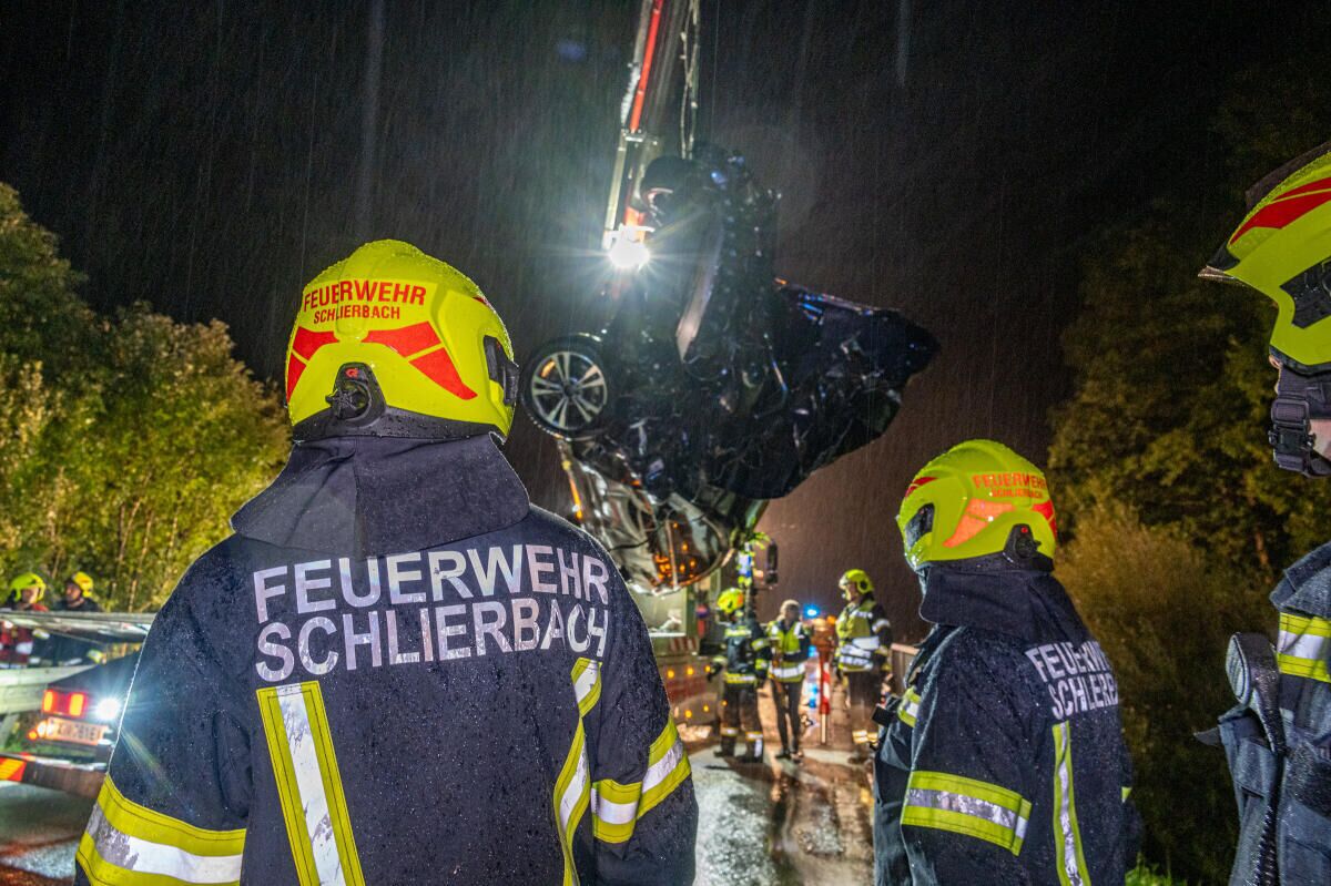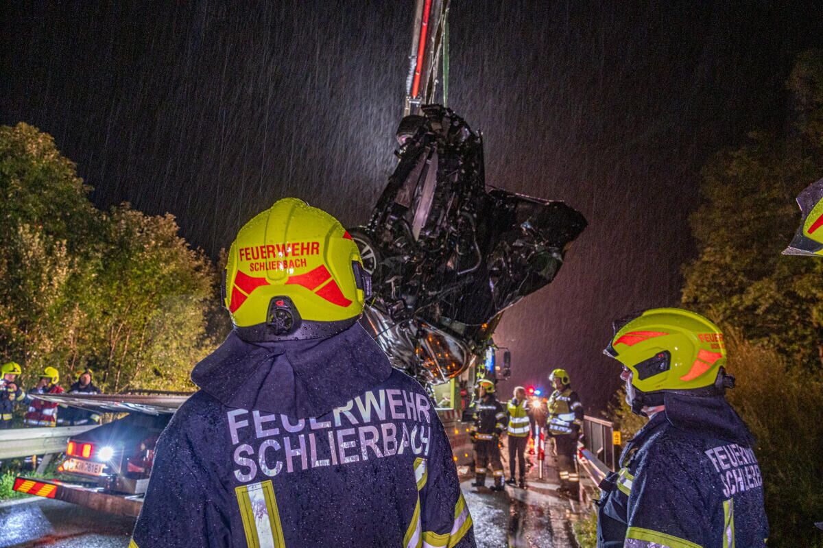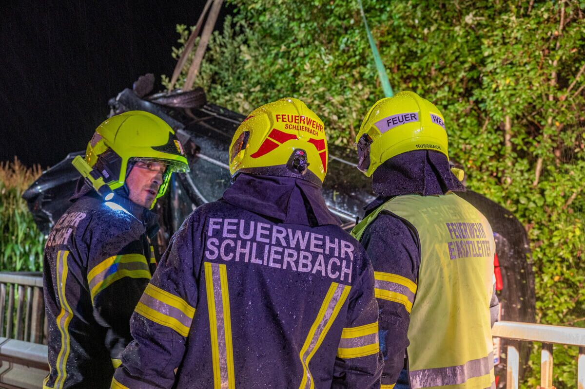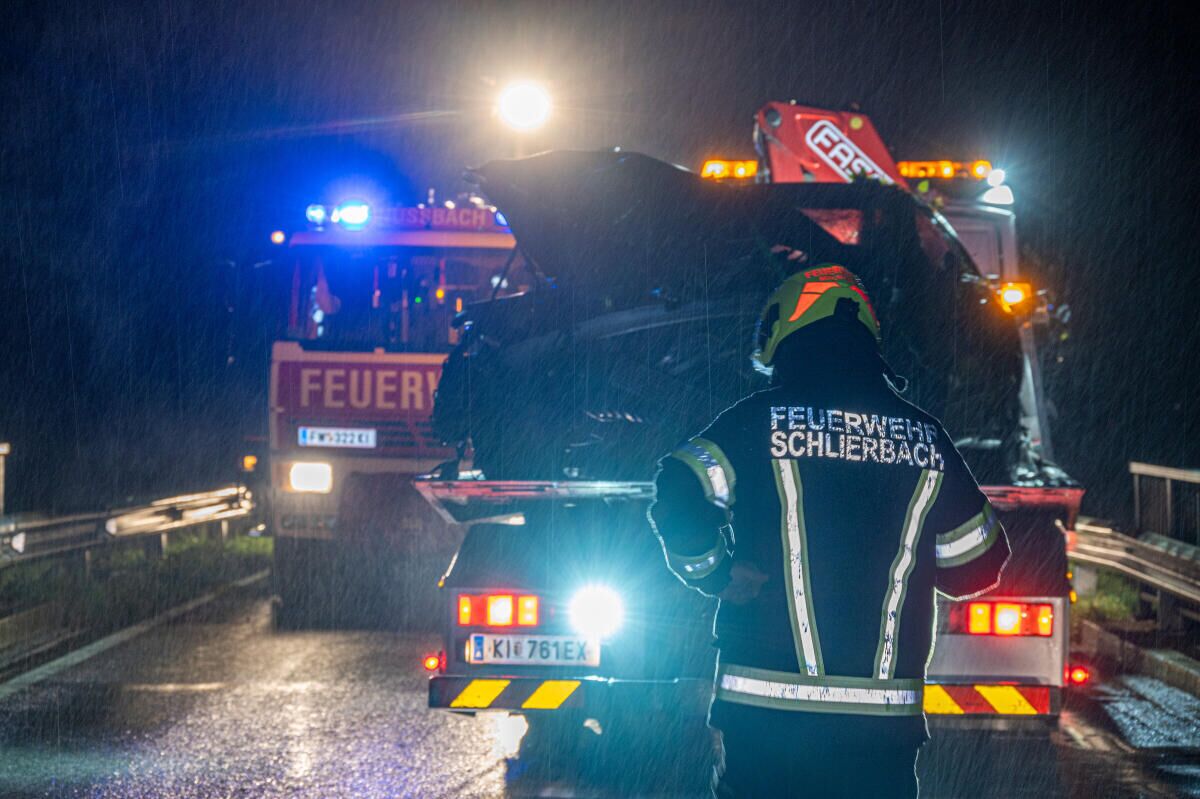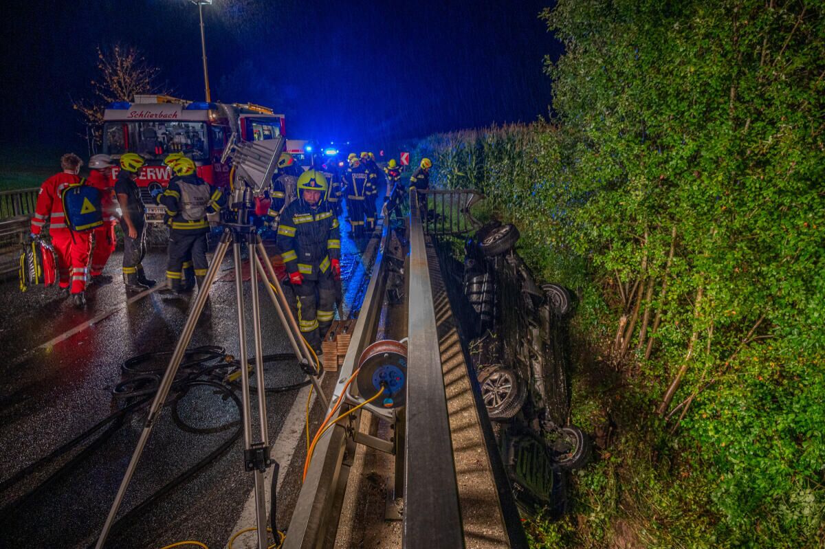 Die Frau aus dem Bezirk Grieskirchen kam aus bislang unbekannter Ursache von der Fahrbahn ab, fuhr auf die Leitplanke, kollidierte mit einem Brückengeländer, überschlug sich und kam in Seitenlage neben einer Brücke auf einer Böschung zum Stillstand. Die Feuerwehr entfernte die Heckscheibe und die Unfalllenkerin konnte das Fahrzeug eigenständig verlassen; sie wurde anschließend auf dem Spineboard über die Böschung zum Rettungsauto getragen. Ein Abschleppunternehmen und die Feuerwehr bargen das Auto. Die L554 war zwischen Schlierbach und Jageredt für 1,5 Stunden total gesperrt.