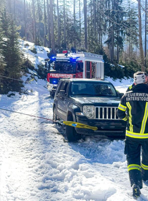 HINTERSTODER. Ein winterlicher Wochenendausflug endete am Samstagnachmittag für den Fahrer eines Geländewagens unfreiwillig mit einem Feuerwehreinsatz.