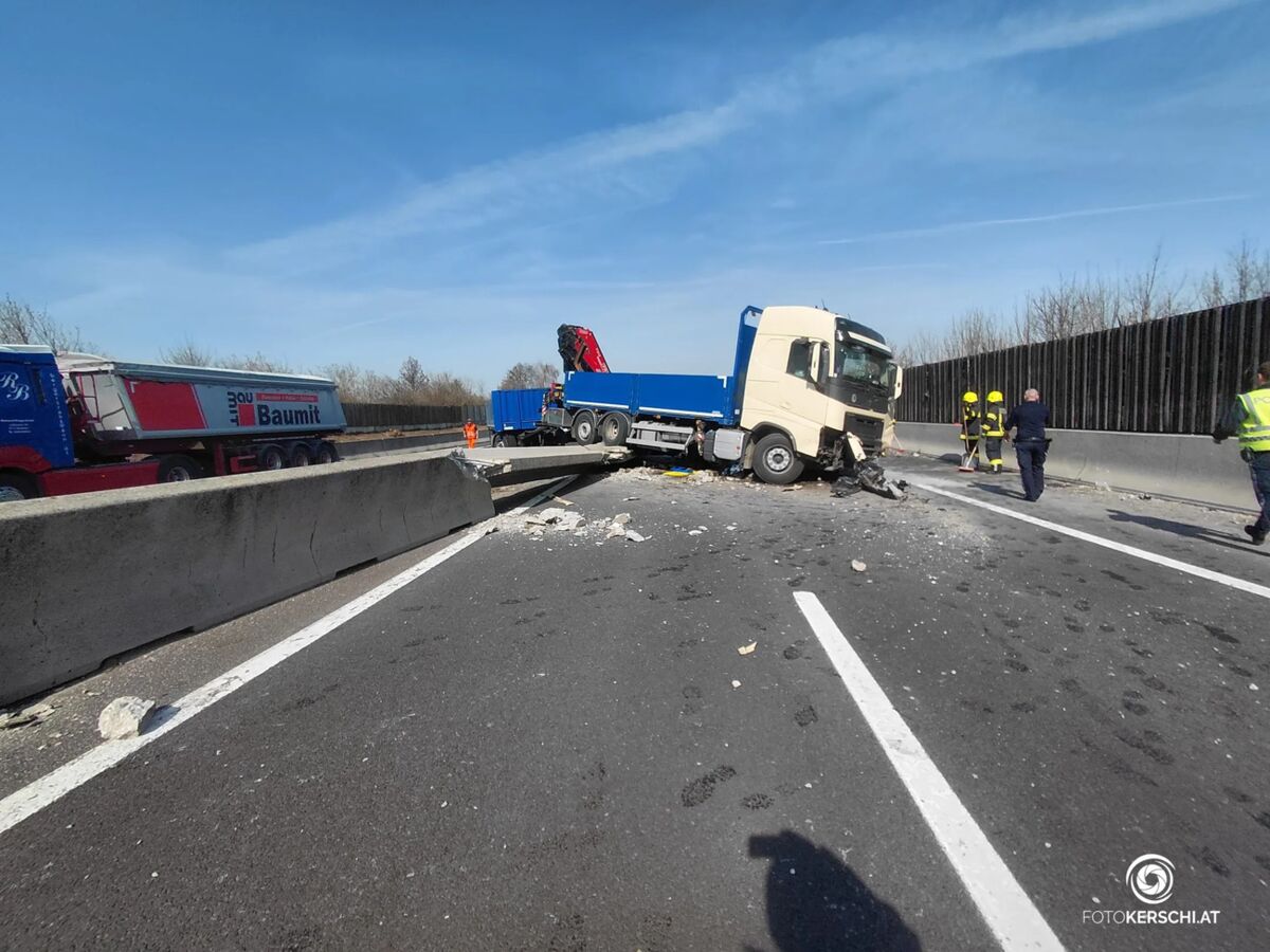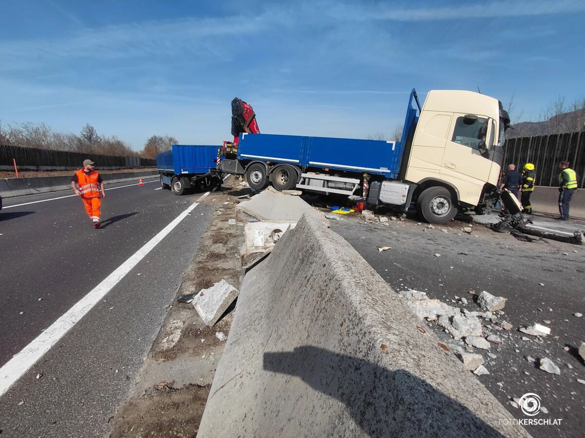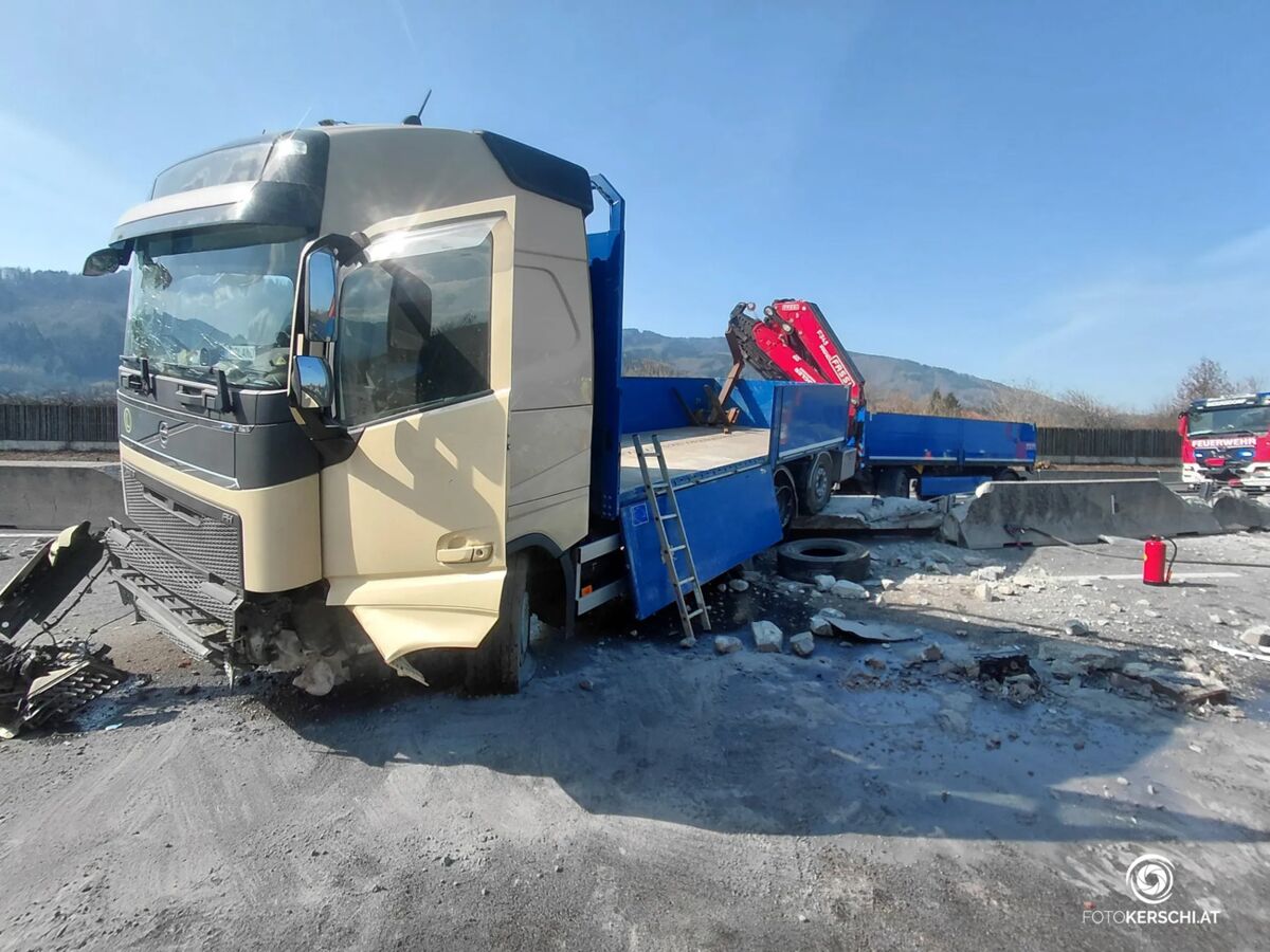 Auf der A9 Pyhrnautobahn in Oberösterreich ist am Dienstag ein schwerer Verkehrsunfall mit einem Lastkraftwagen passiert. Aus bisher nicht geklärter Ursache verlor der Lenker die Kontrolle über das Fahrzeug, worauf der Lkw mit erheblicher Wucht gegen die Betonmittelleitwand prallte und diese durchstieß.