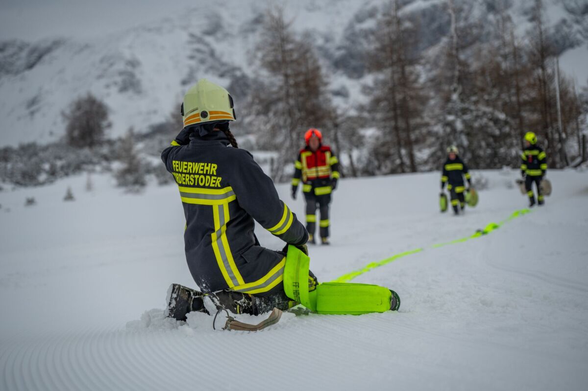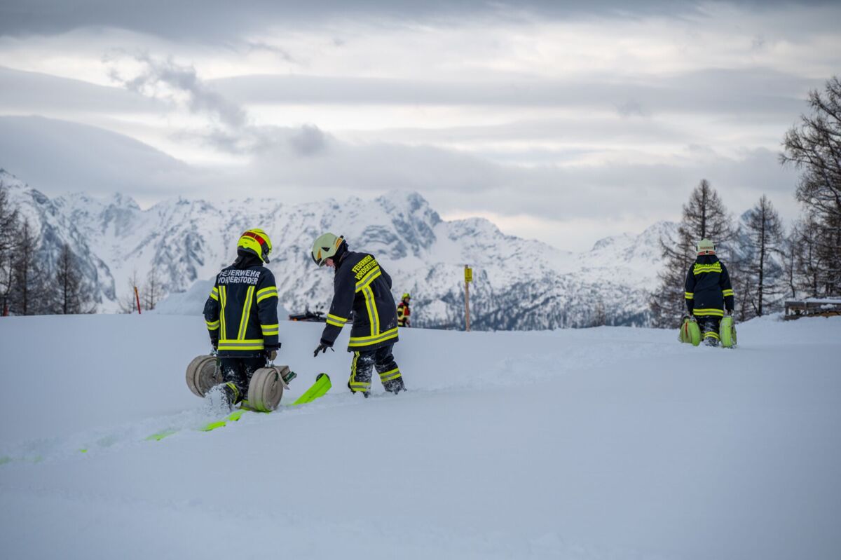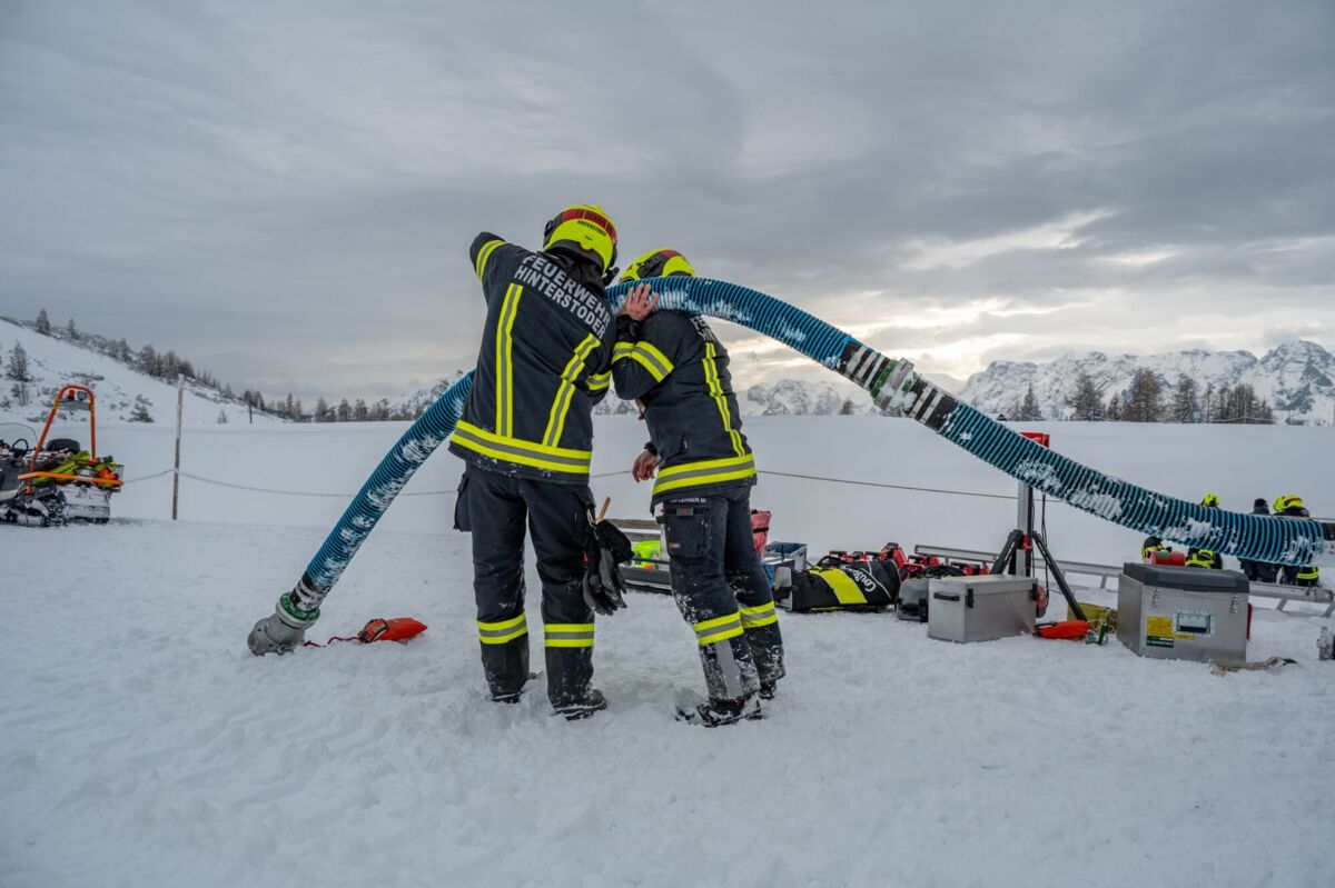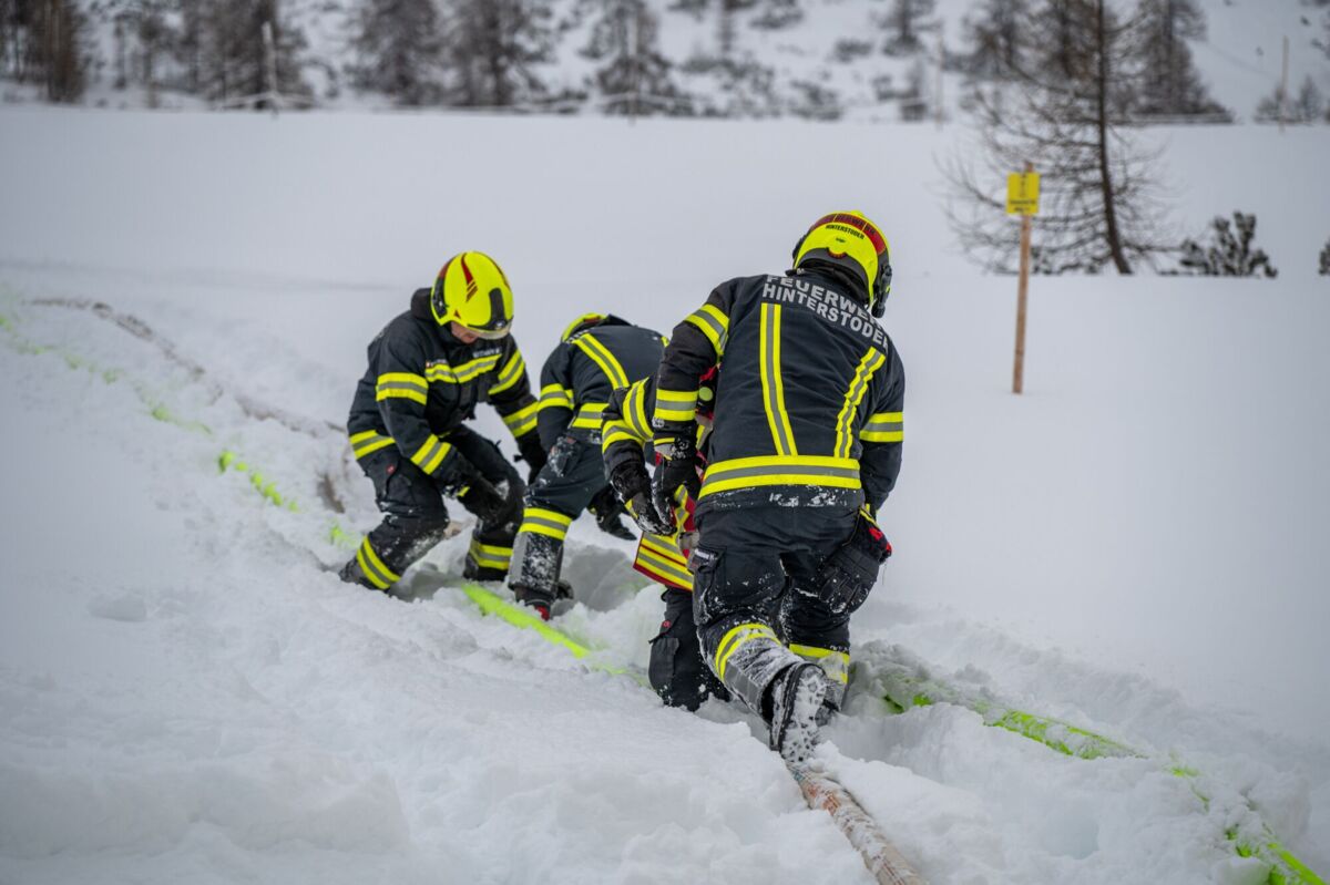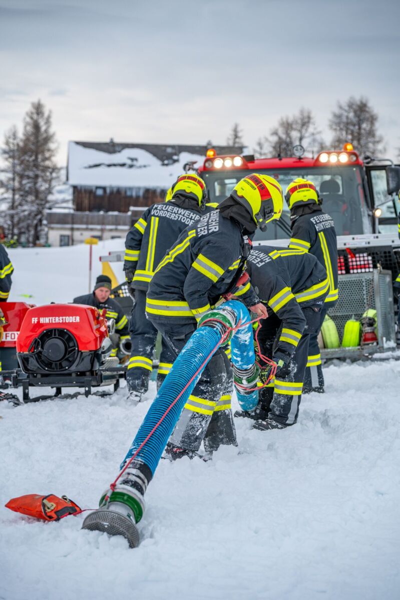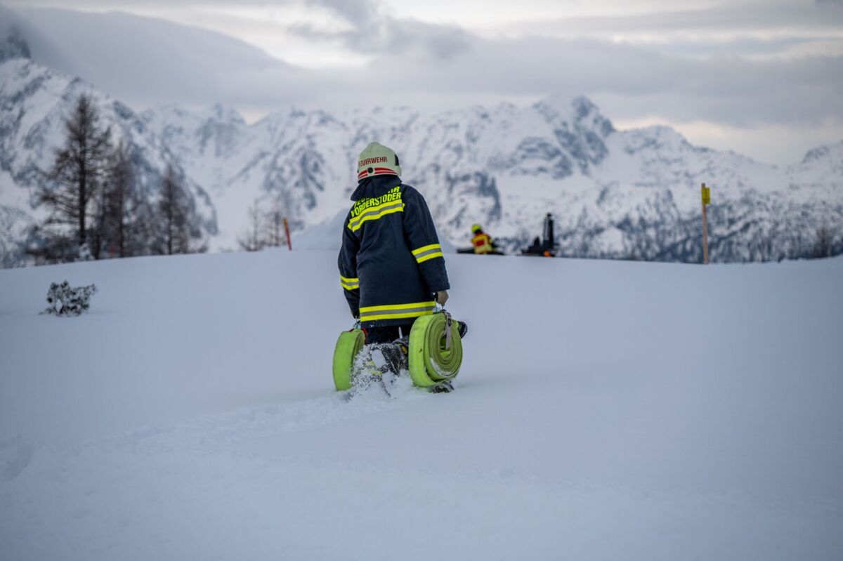 HINTERSTODER. Was passiert, wenn es auf 1.800 Metern Seehöhe brennt, während das Skigebiet im Tiefschnee versinkt? Um für den Ernstfall am Berggasthof gerüstet zu sein, haben sich die Feuerwehren Hinter- und Vorderstoder am Samstag einer ganz besonderen Herausforderung gestellt.