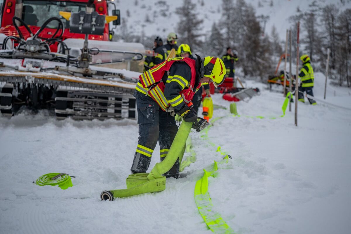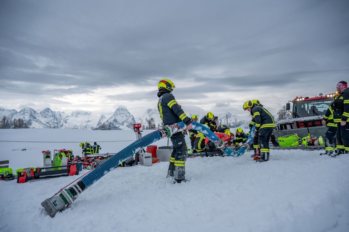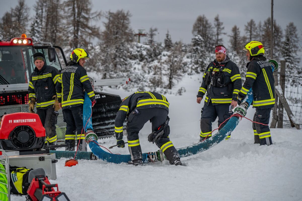 Die größte Knacknuss war jedoch die Wasserversorgung. Zuerst mussten sich die EInsatzkräfte mit der Motorsäge durch eine dicke Eisschicht am Speichersee kämpfen. Als das Loch endlich frei war, kam die nächste Hürde: Der Wasserstand im Teich war extrem niedrig, da die Schneekanonen im Skigebiet auf Hochtouren liefen, um die Pisten für die Gäste perfekt zu präparieren. Das machte das Auslegen der Saugleitung und das Ansaugen zu einer echten Millimeterarbeit.