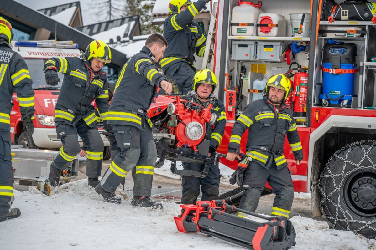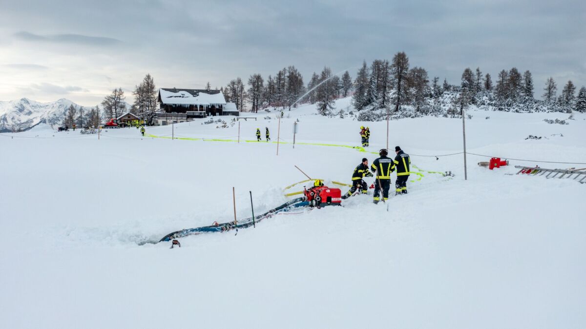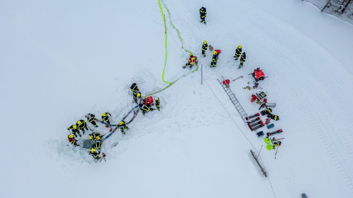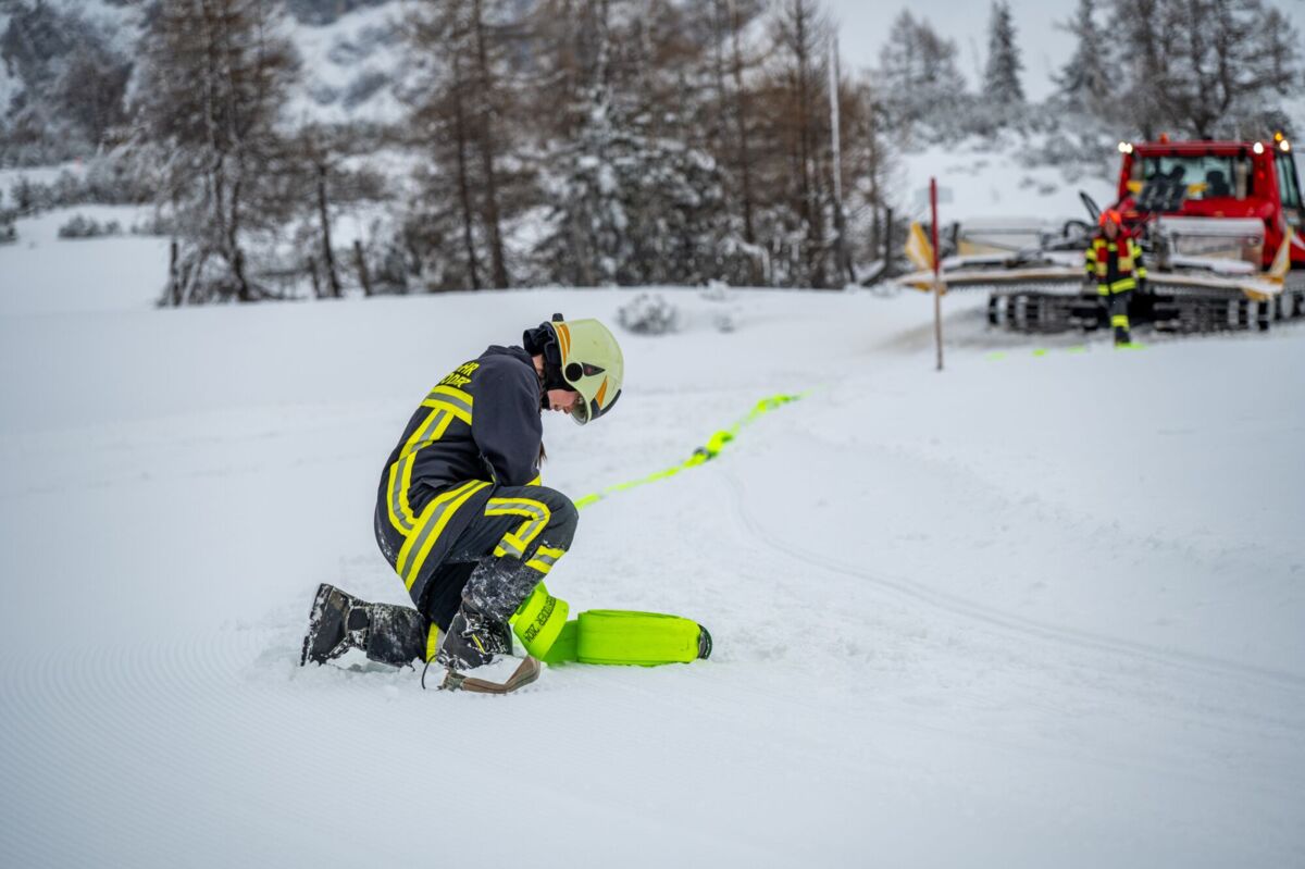 Die größte Knacknuss war jedoch die Wasserversorgung. Zuerst mussten sich die EInsatzkräfte mit der Motorsäge durch eine dicke Eisschicht am Speichersee kämpfen. Als das Loch endlich frei war, kam die nächste Hürde: Der Wasserstand im Teich war extrem niedrig, da die Schneekanonen im Skigebiet auf Hochtouren liefen, um die Pisten für die Gäste perfekt zu präparieren. Das machte das Auslegen der Saugleitung und das Ansaugen zu einer echten Millimeterarbeit.