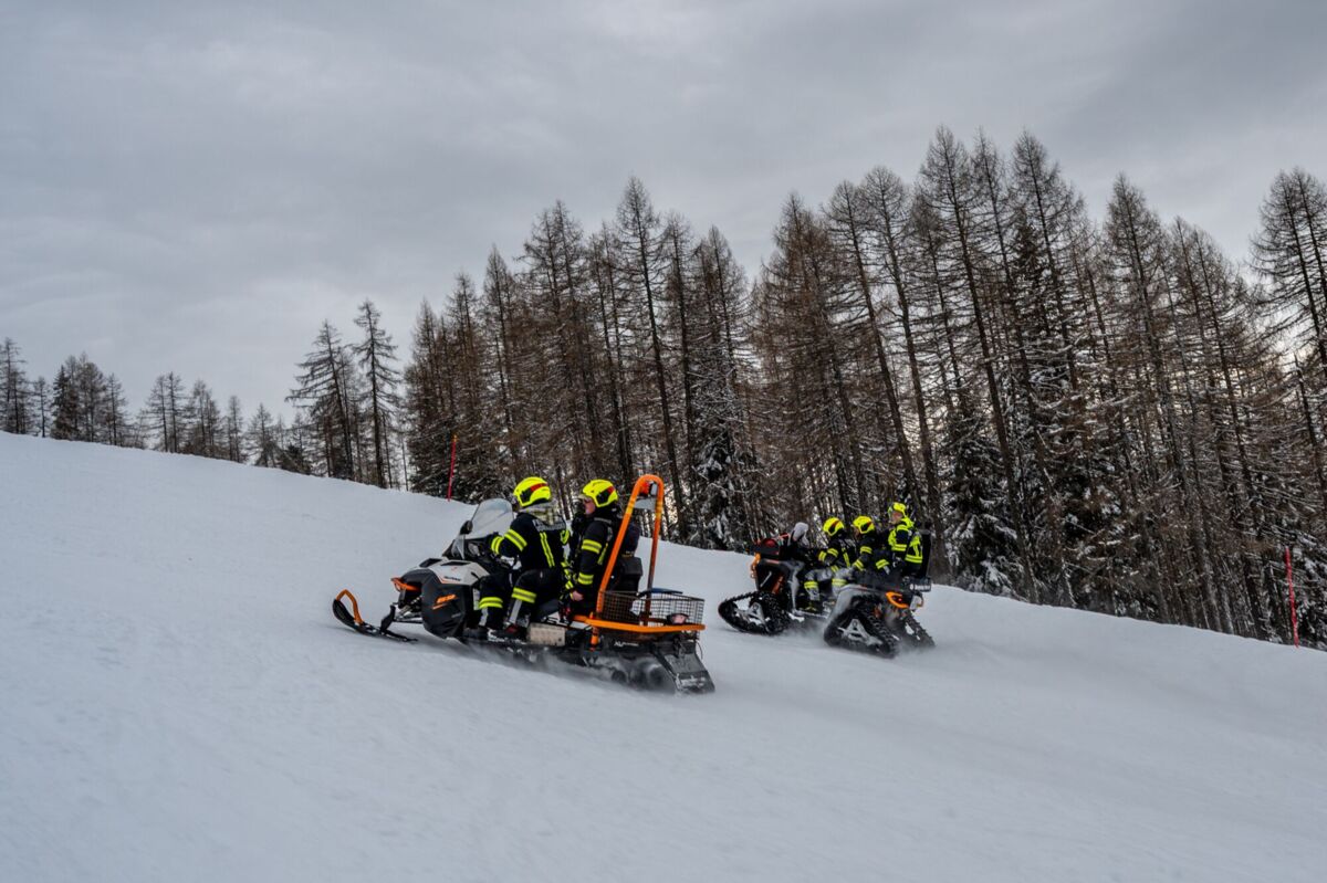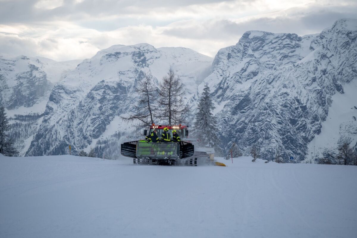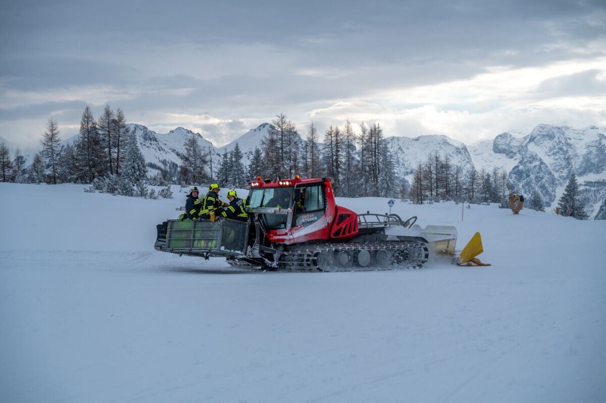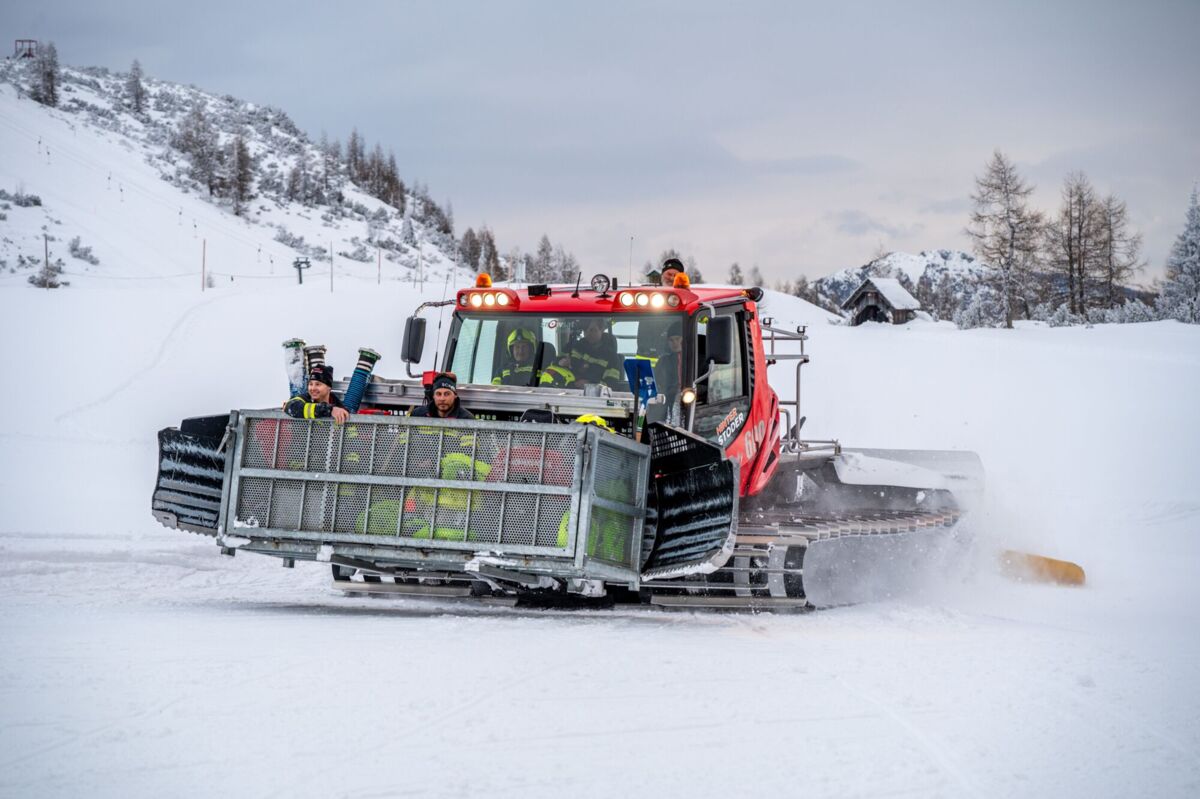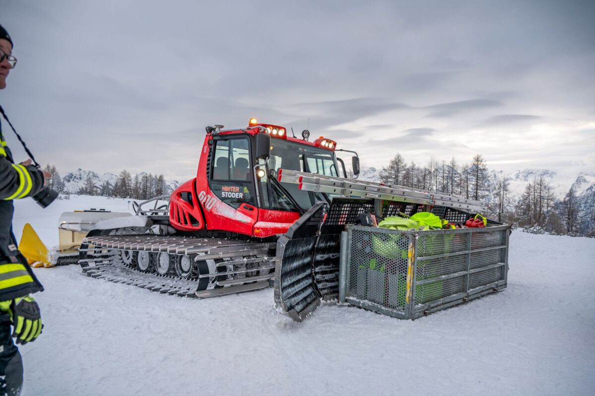Um 16 Uhr ging es los. Da die schweren Löschfahrzeuge im tiefen Schnee nicht bis ganz nach oben kommen, endete die Fahrt zunächst bei der Mittelstation auf den Hutterer Böden. Ab hier hieß es: Umsteigen. Dank der Unterstützung durch die Bergbahnen standen zwei Pistengeräte und ein Skidoo bereit.