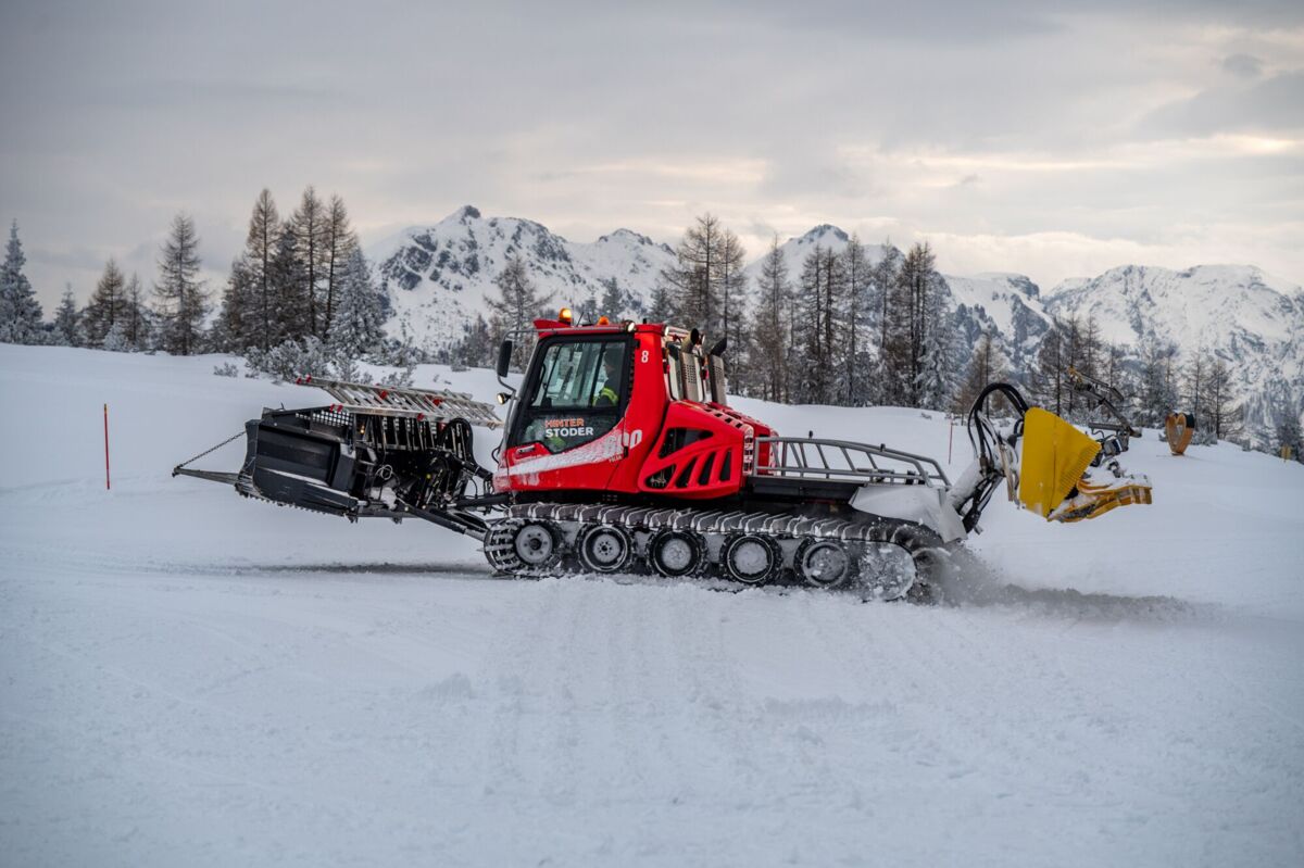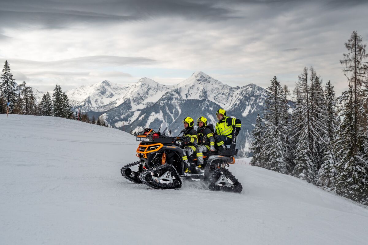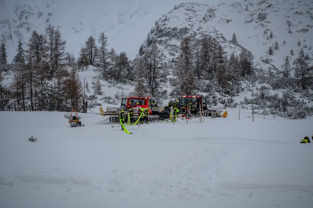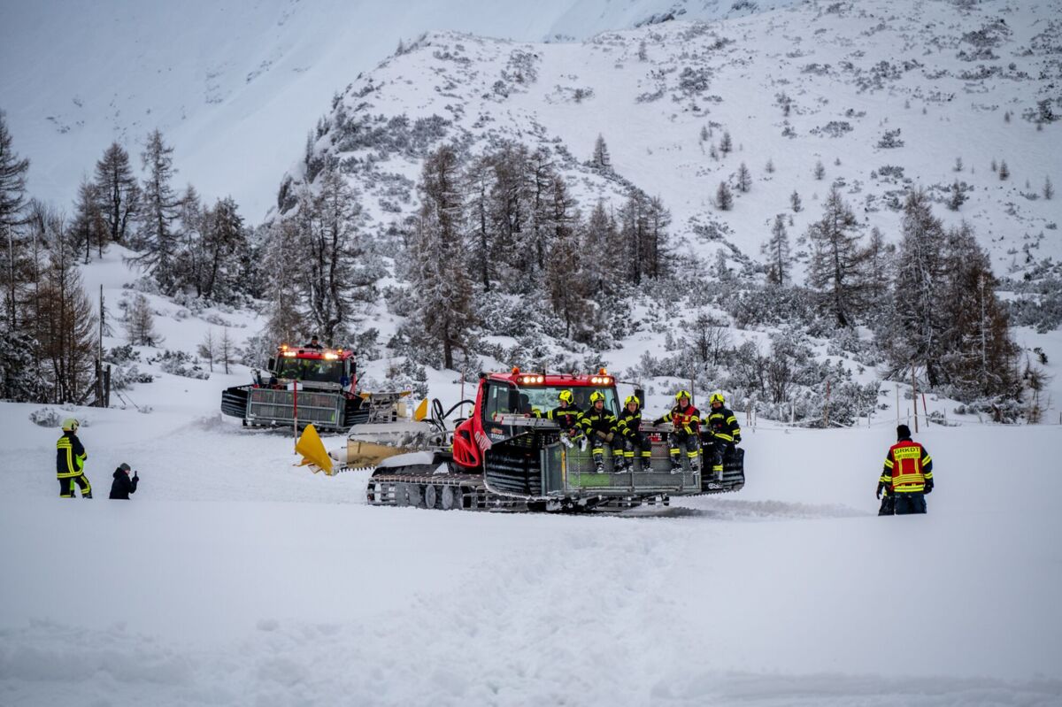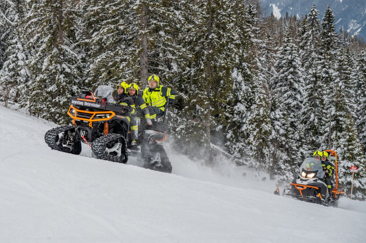 Um 16 Uhr ging es los. Da die schweren Löschfahrzeuge im tiefen Schnee nicht bis ganz nach oben kommen, endete die Fahrt zunächst bei der Mittelstation auf den Hutterer Böden. Ab hier hieß es: Umsteigen. Dank der Unterstützung durch die Bergbahnen standen zwei Pistengeräte und ein Skidoo bereit.