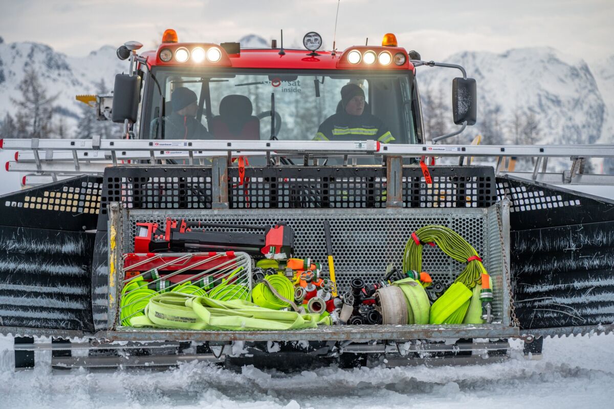 Das Verladen der Ausrüstung auf die Pistenbullys ist Teamarbeit pur. Die Feuerwehrleute haben Pumpen, Schläuche und Beleuchtung verstaut und sich durch den Schnee nach oben gekämpft.