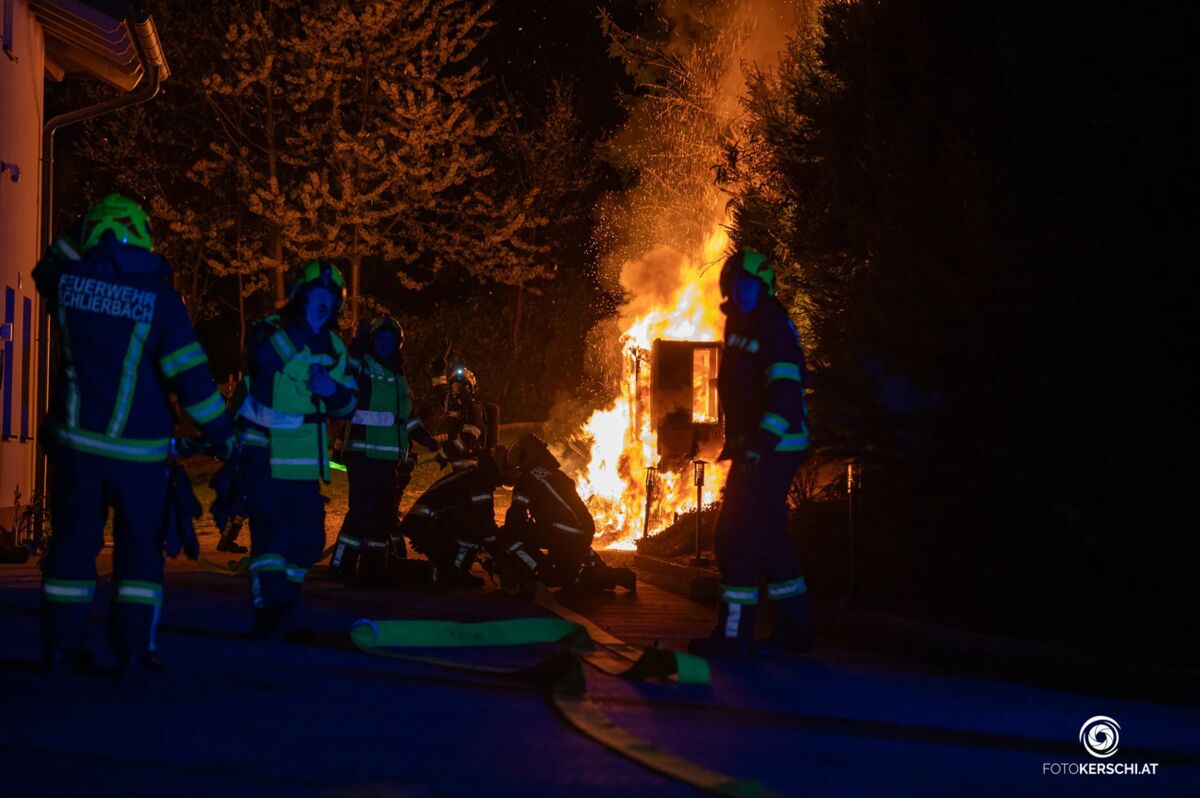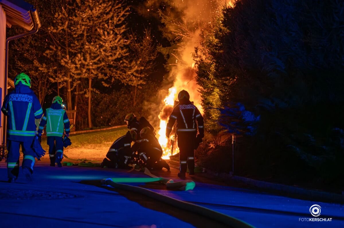 SCHLIERBACH. In Schlierbach ist ein Holzstoß in Brand geraten, wodurch auch eine Luftwärmepumpe und eine Hecke Feuer fingen.