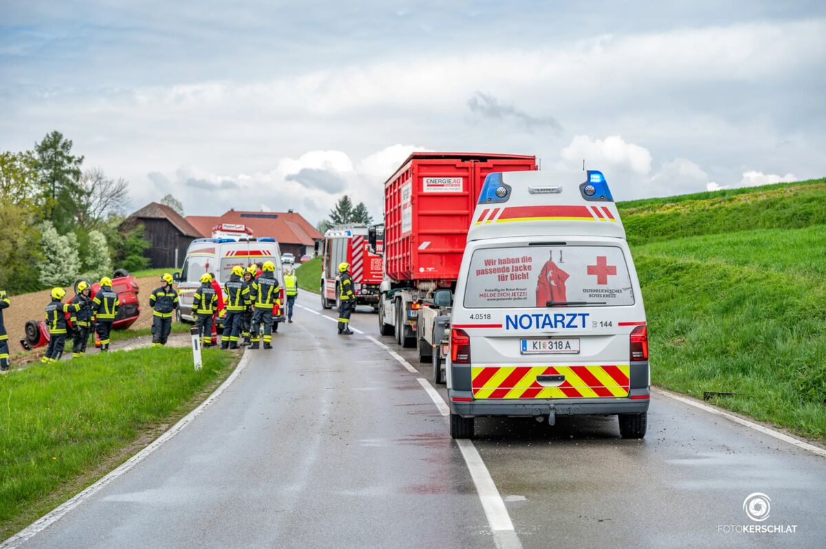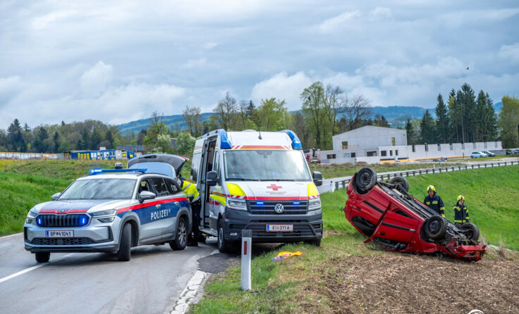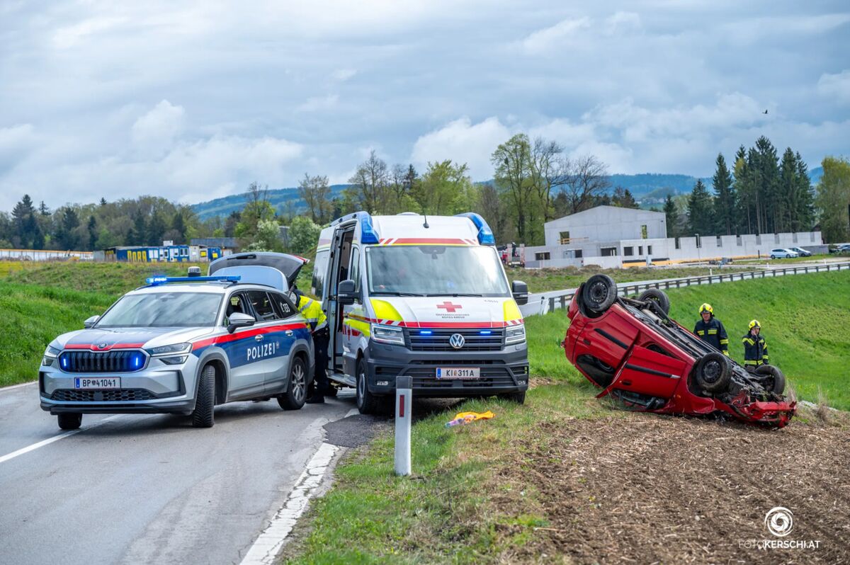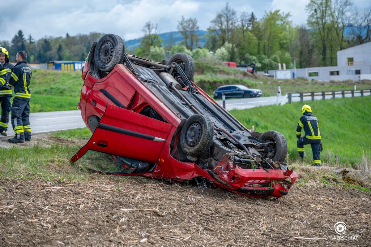 WARTBERG AN DER KREMS. Auf der Schlierbacher Straße hat sich ein Pkw nach einem missglückten Überholmanöver überschlagen, der Wagen blieb in einem Feld auf dem Dach liegen.