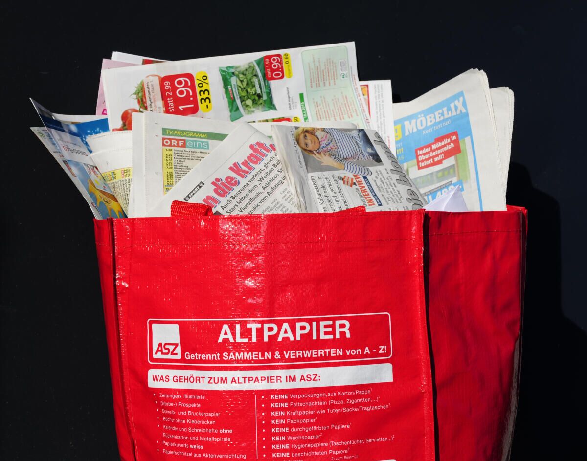 Grundsätzlich dürfen alle sauberen Papier- und Kartonagenerzeugnisse, wie Zeitungen, Kataloge, Briefe, Kalender, Papiersäcke und Wellpappe hinein. Sobald diese jedoch verschmutzt oder mit anderen Materialien verbunden sind, gehören diese in eine andere Tonne. Also Pizzaschachtel, Papierhandtücher, Milchpackerl, aber auch Backpapier und Fotos gehören nicht in die Rote Tonne. Kleine Schachteln sind in der Roten Tonne platzsparend gefaltet oder zerlegt zu verstauen. Große Kartongagen sind ins nächste Altstoffsammelzentrum zu bringen.