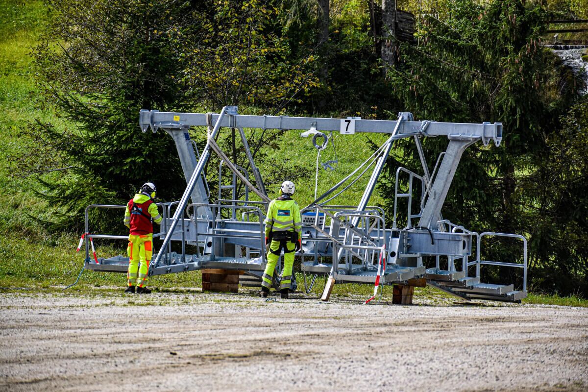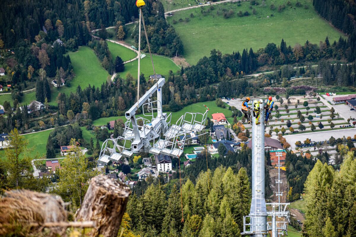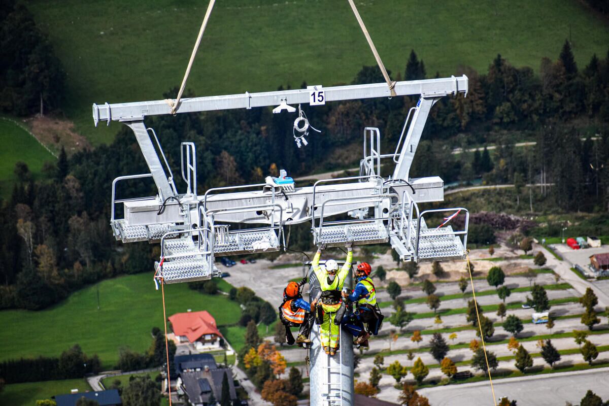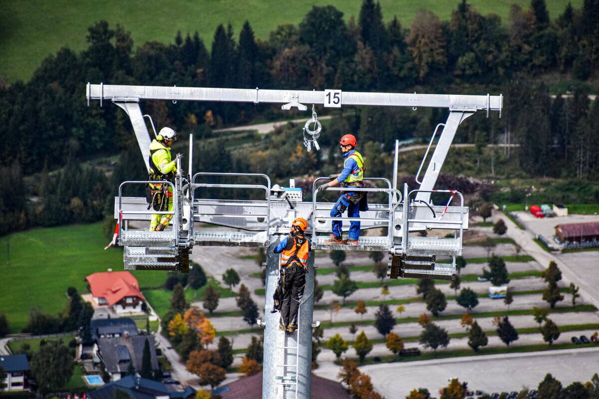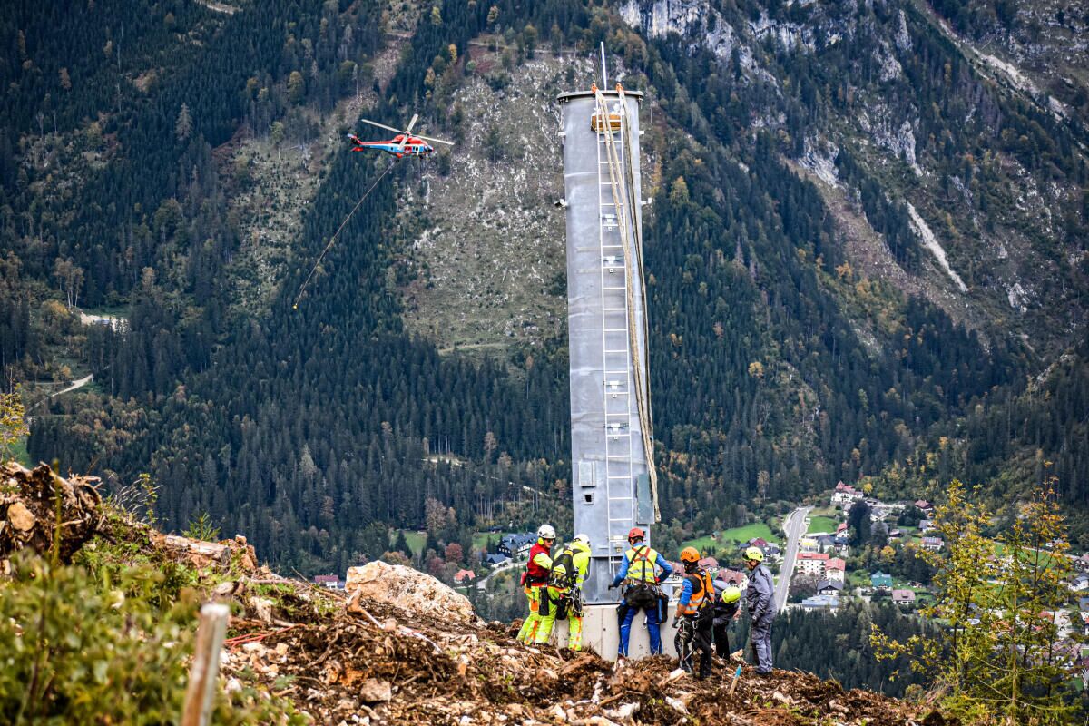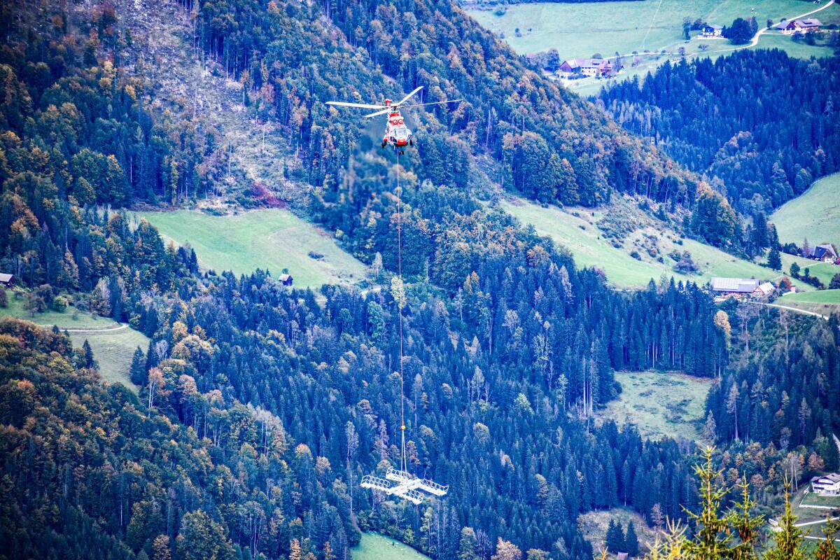HINTERSTODER. Im Zuge des Neubaus der Hössbahn in Hinterstoder wurden am 28. September die letzten sechs der 19 Stützen an ihren Standpunkt geflogen und montiert.