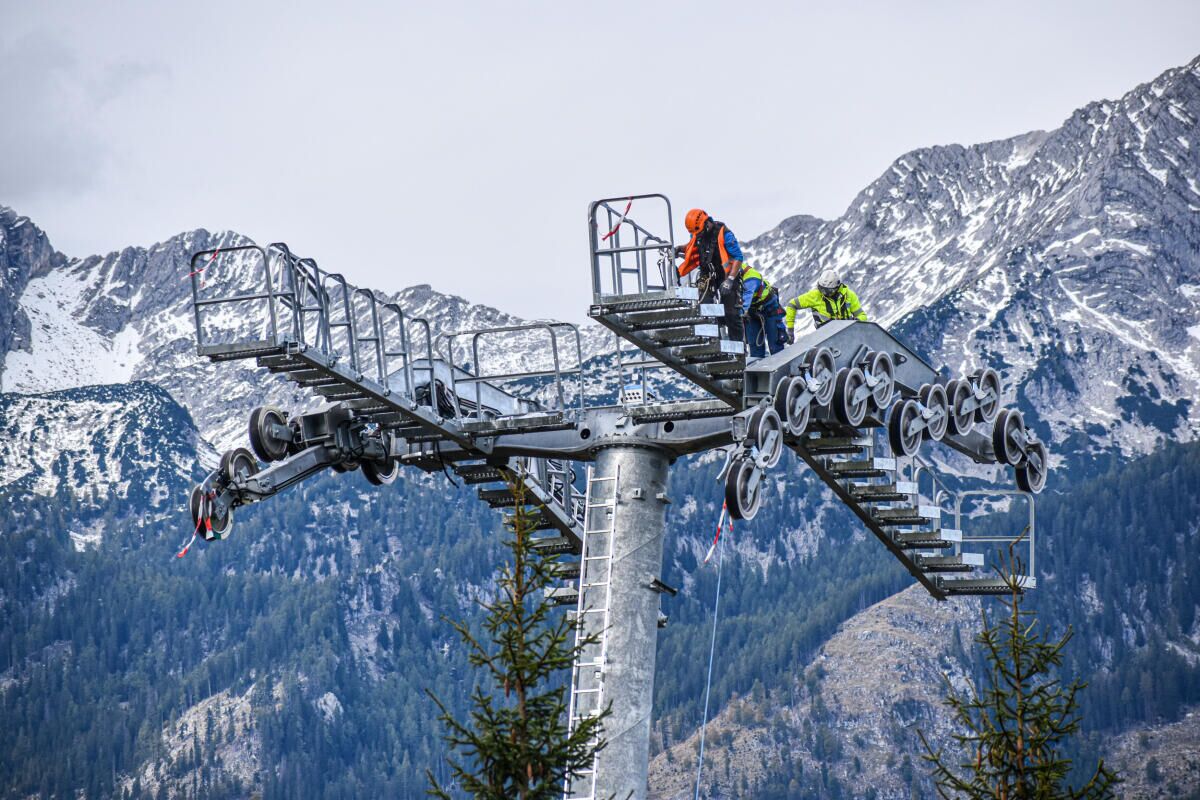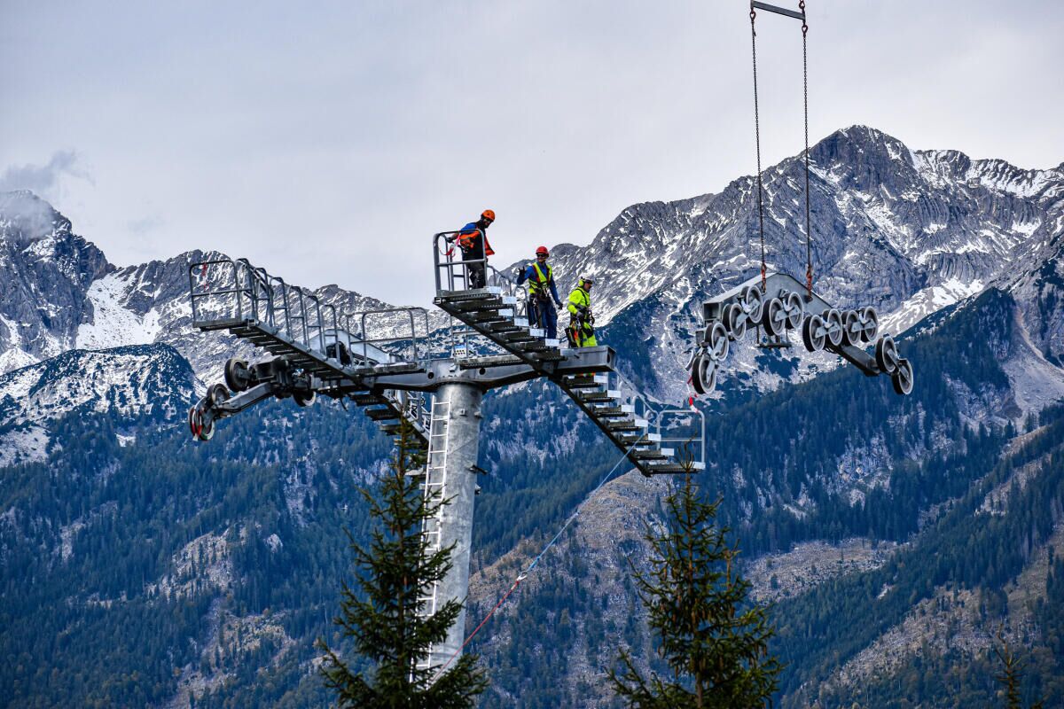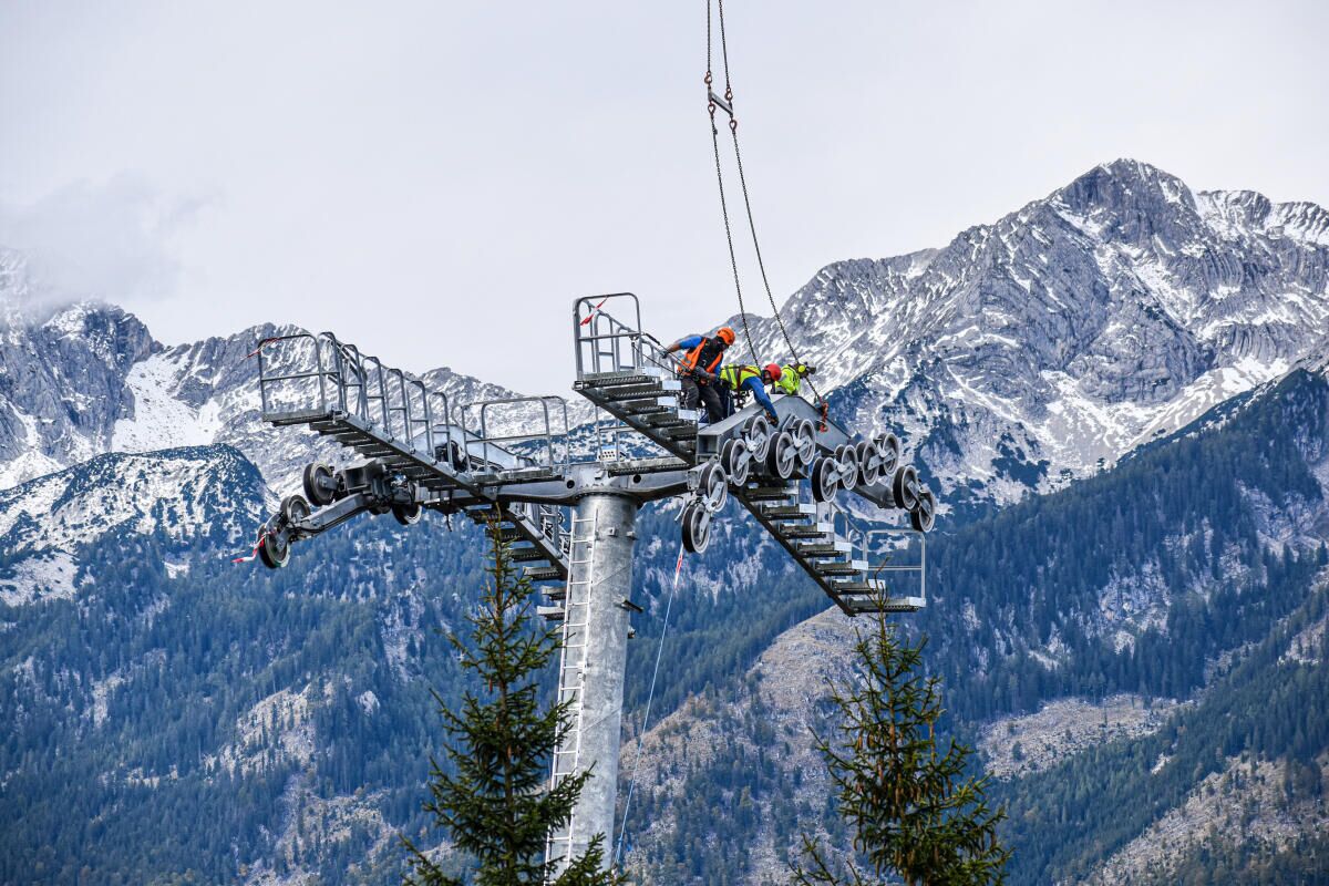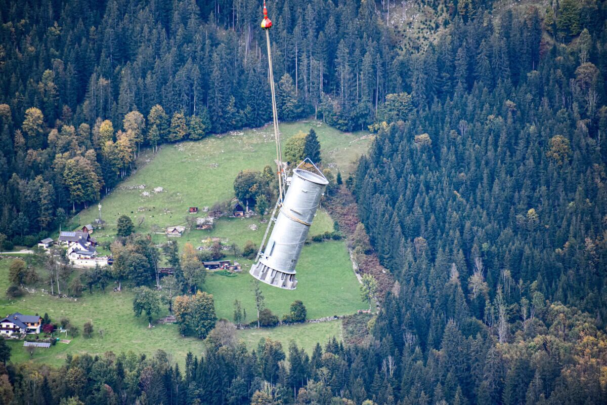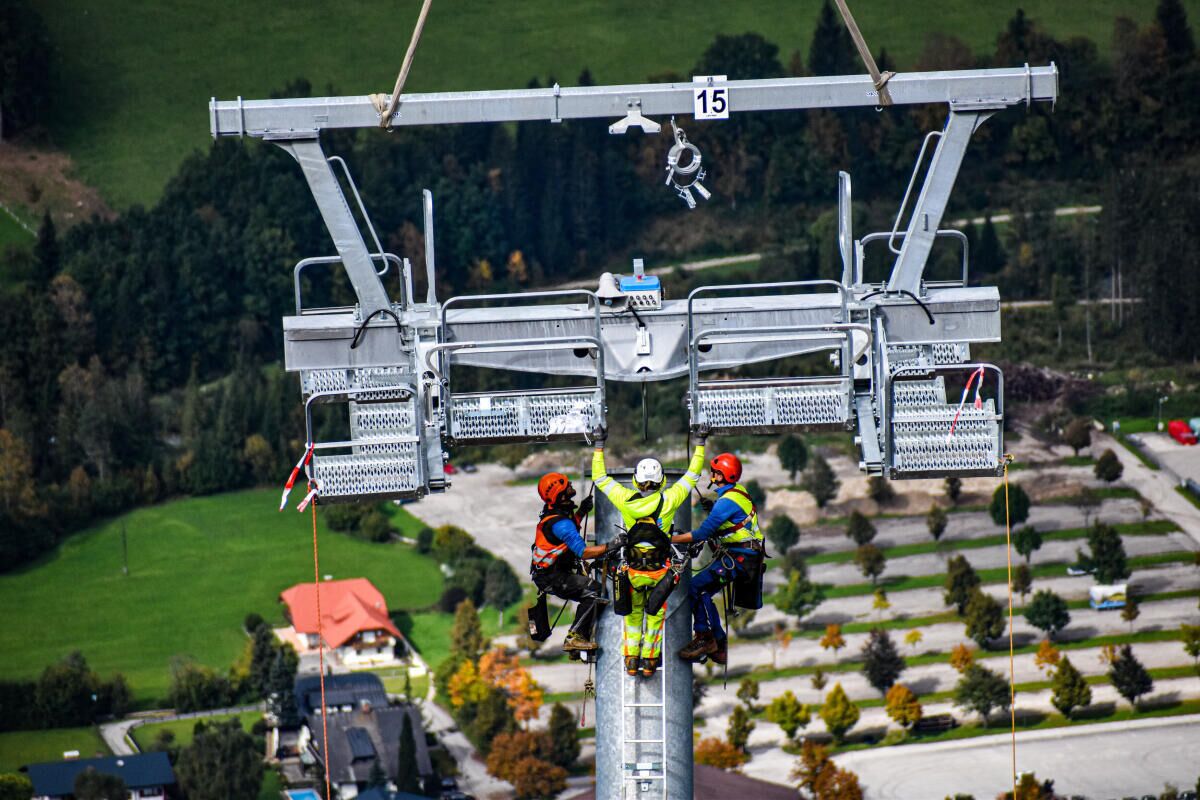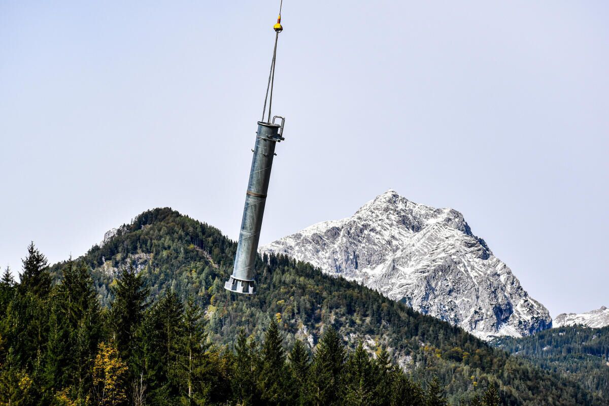 HINTERSTODER. Im Zuge des Neubaus der Hössbahn in Hinterstoder wurden am 28. September die letzten sechs der 19 Stützen an ihren Standpunkt geflogen und montiert.