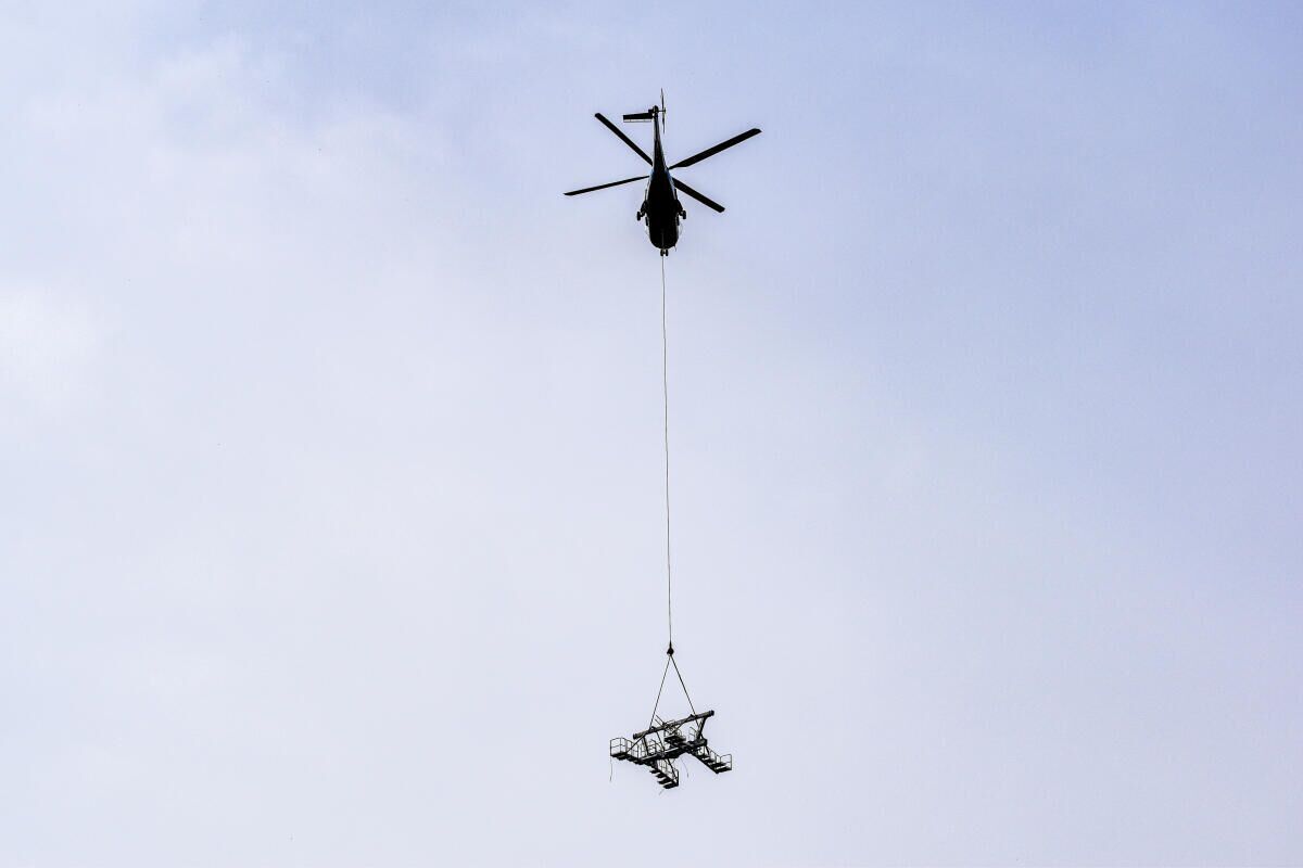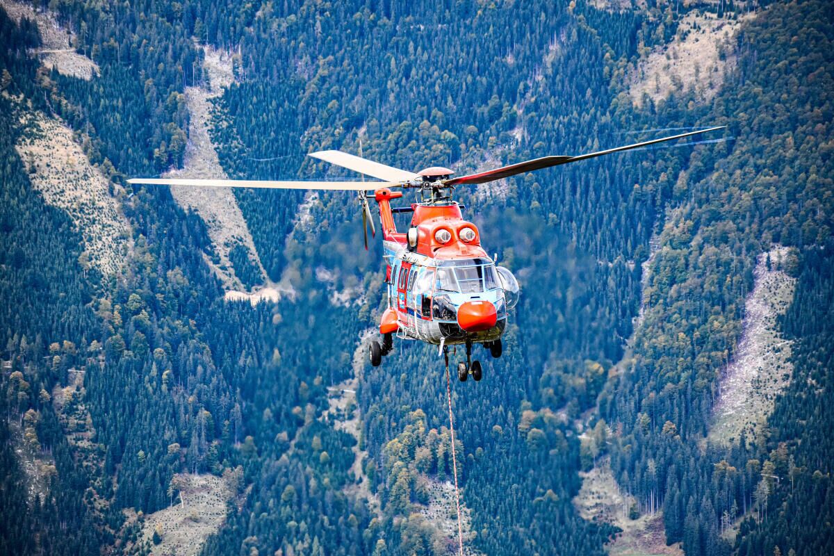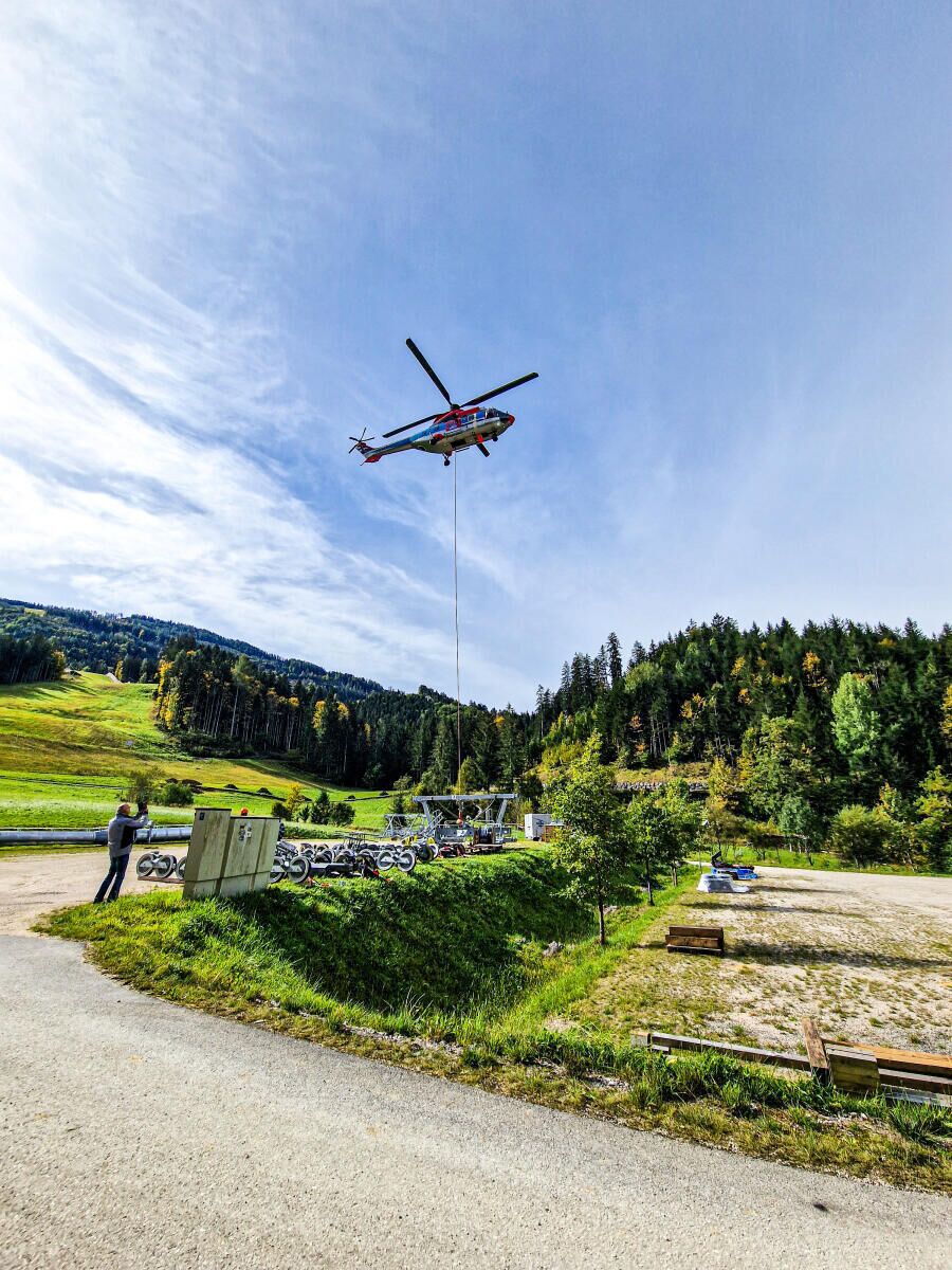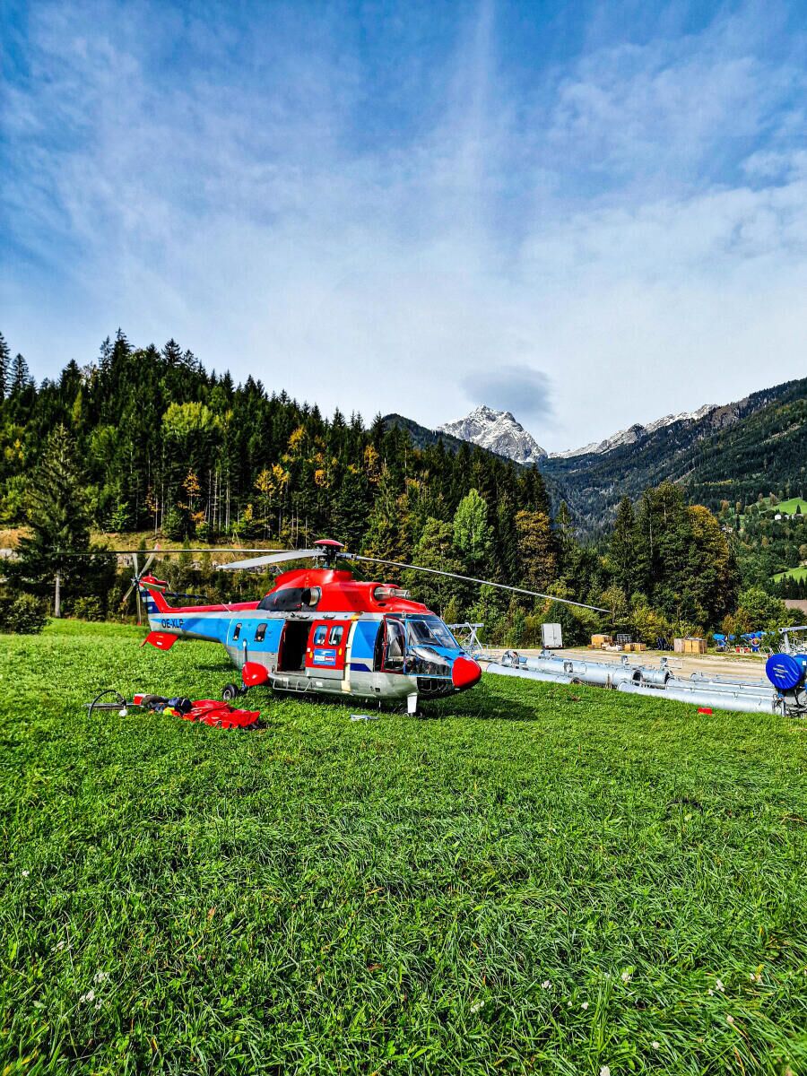 Der Größte Transporthubschrauber der Firma Heli Austria, die sogenannte „SuperPuma“ mit einer Hubkraft von circa 4.000 kg kümmerte sich um die Stützenschäfte, die „Belle 212“ um die etwas leichteren Rollenbatterien und Stützenjochs.