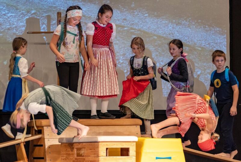 Die Turnflöhe und Springginkerl zeigten ihre Übungen am Airtrack, während die größeren Kinder einen Berg bestiegen und sich dann wagemutig zu Tal stürzten. Die Gerätturner flogen wie Noten durch die Luft und zeigten anschließend ihre Einzelübungen auf Matte, Schwebebalken und Reck. Nicht fehlen durfte auch die Step-Aerobic-Gruppe mit einer kurzweiligen Choreografie. Als Gäste durften heuer die Plattlermädels aus Wartberg begrüßt werden, die zeigten, dass Schuhplatteln durchaus auch Frauensache sein kann.