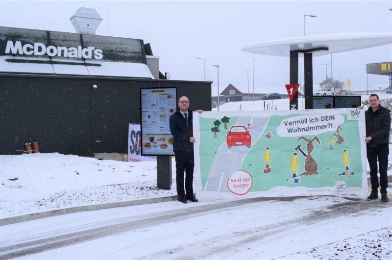 INZERSDORF IM KREMSTAL. Entlang von stark befahrenen Straßen landet leider immer wieder Müll im Straßengraben. Anlässlich der Eröffnung des neuen McDonald's in Inzersdorf macht der Bezirksabfallverband (BAV) Kirchdorf einmal mehr darauf aufmerksam, den Abfall nicht aus dem Auto zu werfen. „Wirf nix raus!!!“ steht auf dem Transparent, das beim McDrive im Rahmen einer gemeinsamen Kampagne von BAV und McDonald's aufgehängt wurde.