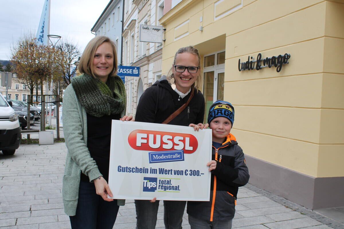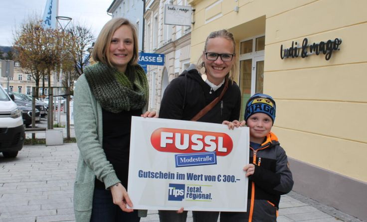 In der Bezirkshauptstadt Kirchdorf war Claudia Diensthuber mit ihrem Sohn Laurenz unterwegs, der sich ein neues Spielzeug aussuchen durfte, als die beiden das Tips-Glücksengerl – in Form der Redakteurinnen Susanne Winter und Sophie Kepplinger – trafen. Auf die Frage nach ihrer Lieblingszeitung antwortete die 39-jährige Mutter „Tips“ und hat damit Modegutscheine im Wert von 300 Euro gewonnen.