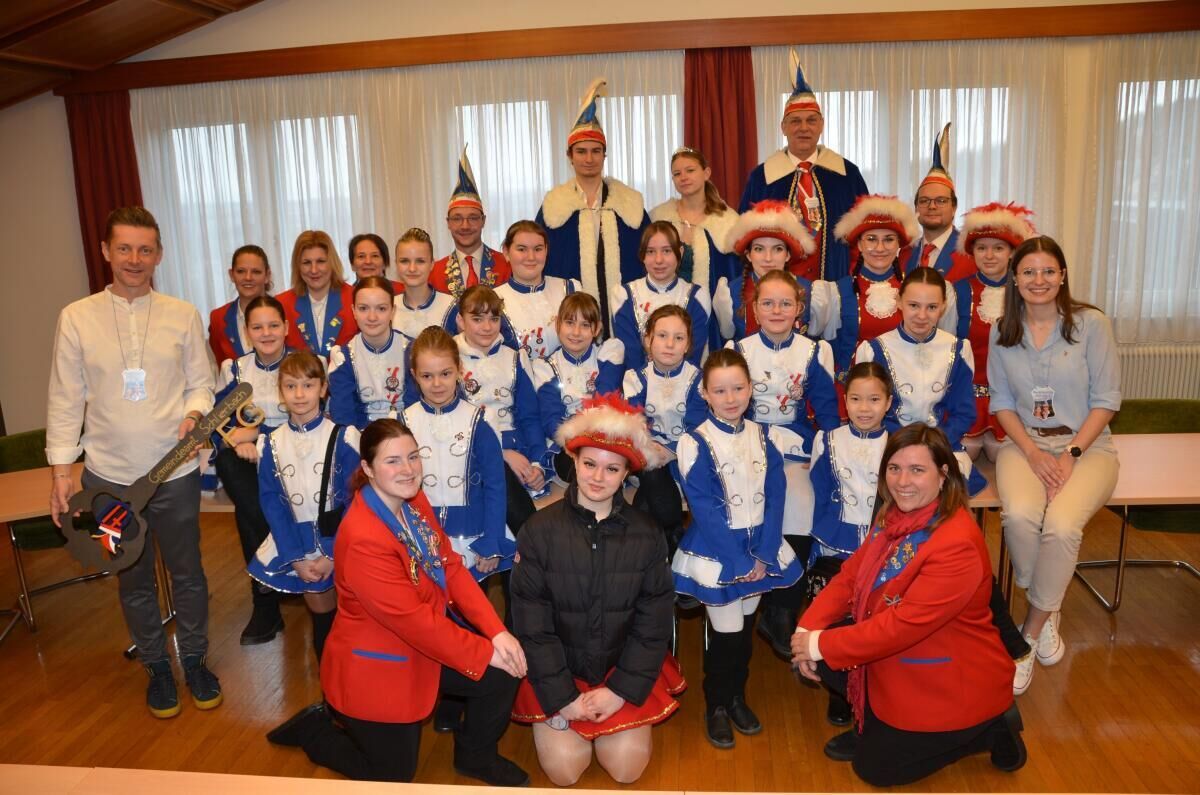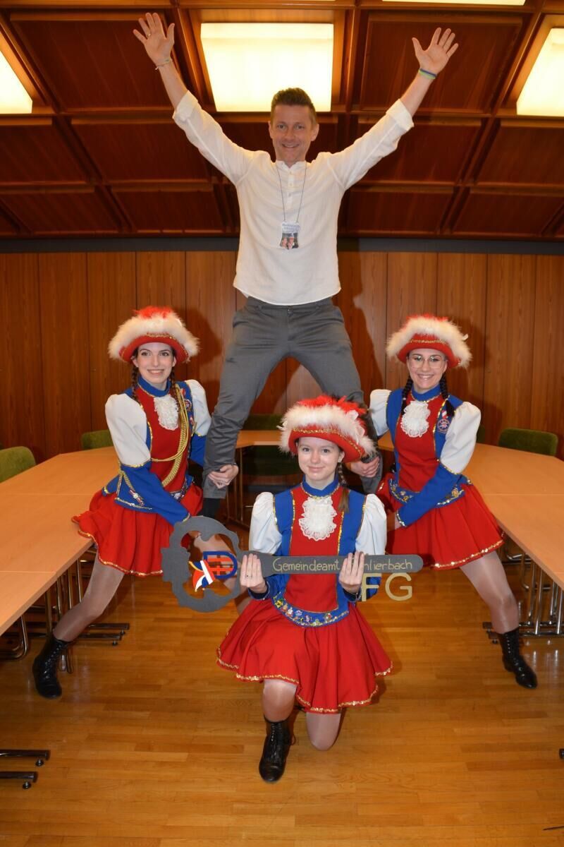 Für einen besonders lustigen Moment sorgte der Bürgermeister selbst. Gemeinsam mit den Gardemädels wagte er erstmals eine Hebefigur. Mit viel Vertrauen und einem breiten Lächeln ließ er sich in die Höhe heben.