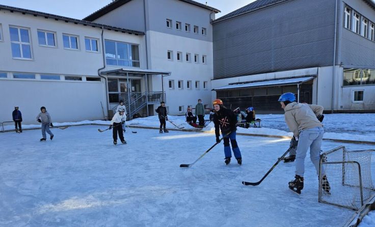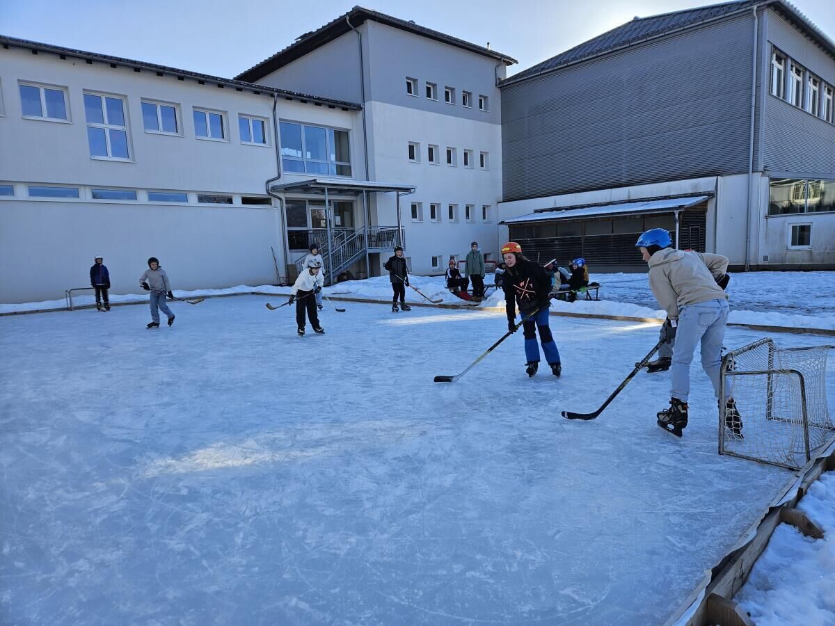 Bis weit in den Februar hinein herrschten gute Bedingungen, sodass die Eisfläche regelmäßig genutzt werden konnte. Die Sportlehrer mussten dabei flexibel auf die Wetterlage reagieren und die Fläche regelmäßig pflegen. Dank kontinuierlichem Auftragen von Wasser in den kalten Nächten blieb das Eis über Wochen in einwandfreiem Zustand – sehr zur Freude der Schüler.