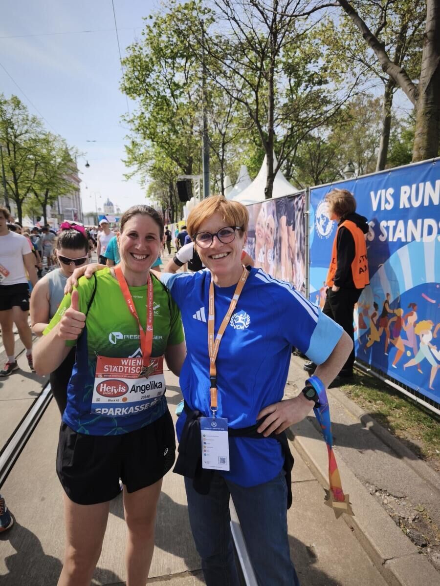 Auch beim Halbmarathon gab es ein besonderes Erlebnis: Angelika Pammer erreichte das Ziel und erhielt ihre Finishermedaille von Vereinskollegin Andrea Gruber, die bei der Medaillenausgabe im Einsatz war.