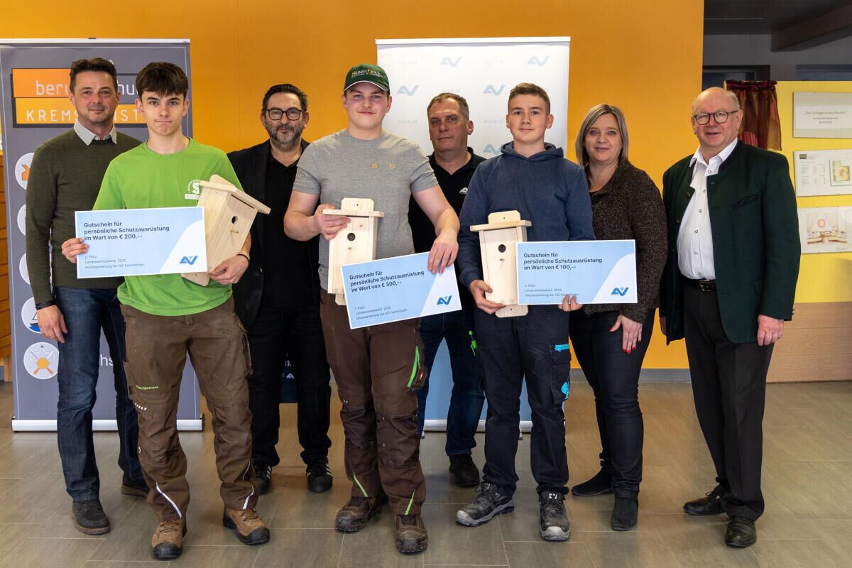 Die Jury – mit unter anderem Landesschulinspektor Johann Plakolm, Landeslehrlingswartin der Tischler Claudia Hindinger, und Markus Putz, Präventionsberater der AUVA – zeigte sich begeistert von den bereits vorhandenen Fachkenntnissen der Schüler und lobte insbesondere die handwerkliche Qualität der praktischen Umsetzungen. Besonders überzeugte Leo Fuchsberger vom Agrarbildungszentrum Lambach: Er sicherte sich den ersten Platz. Fabian Neubauer von der Landwirtschaftlichen Fachschule Schlierbach holte sich den zweiten Platz, Platz drei ging an Lorenz Katerl vom Agrarbildungszentrum Altmünster. Die drei durften sich über Sachpreise, zur Verfügung gestellt von der Allgemeinen Unfallversicherungsanstalt (AUVA), sowie Gutscheine für persönliche Schutzausrüstung freuen.