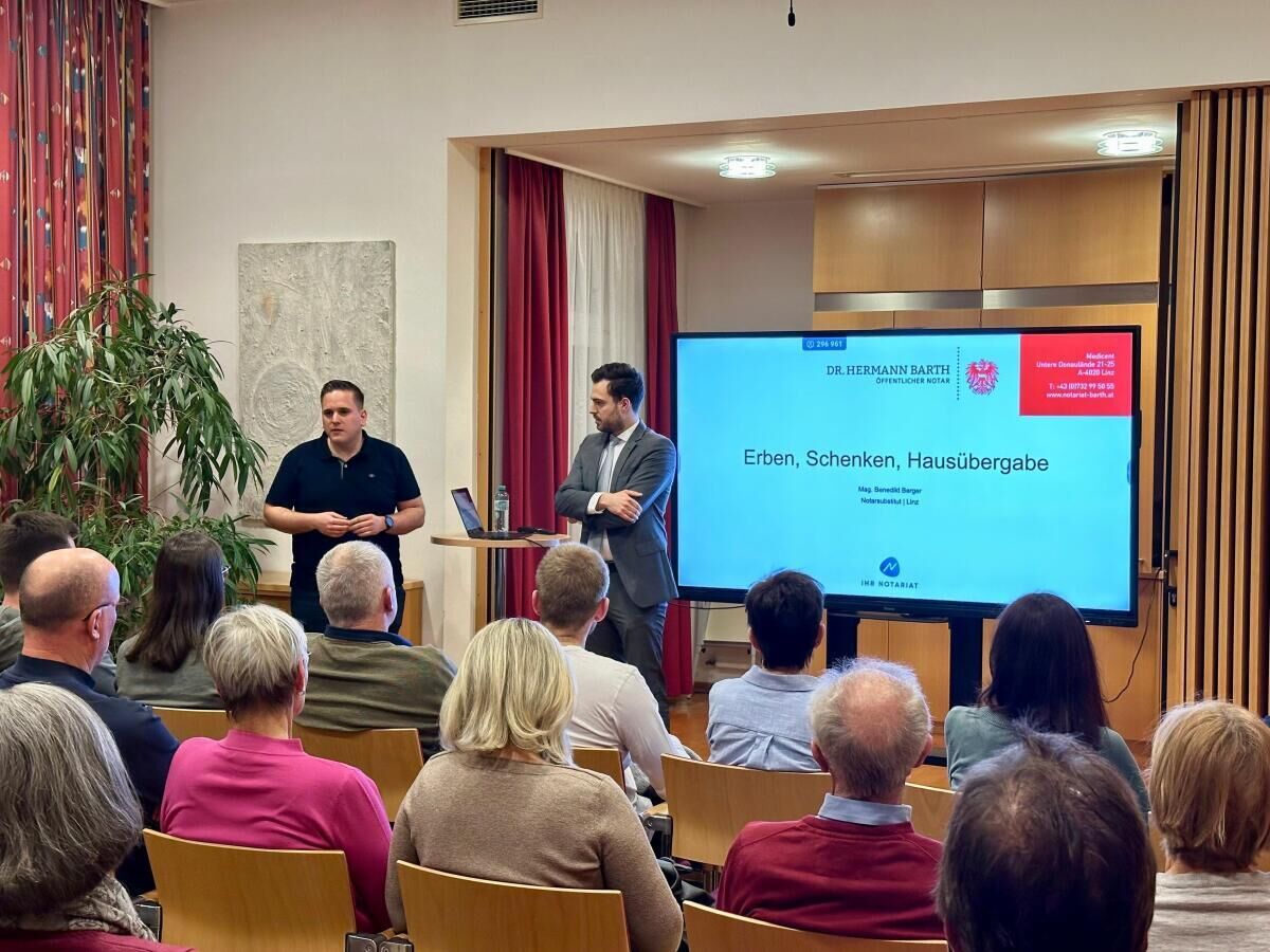 Notarsubstitut Benedikt Berger gab einen Überblick über die geltende Rechtslage zu den Themen Erbe, Schenken und Hausübergabe und erläuterte dabei zentrale Aspekte rund um Vermögensübertragung innerhalb der Familie. Im Anschluss beantwortete er Fragen aus dem Publikum.