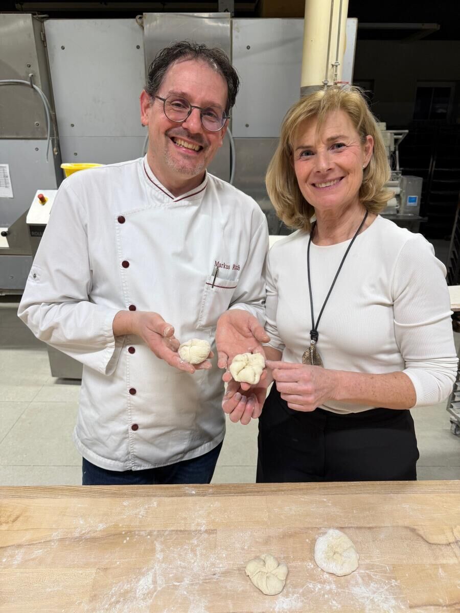 Bäckermeister Markus Resch führte die Gäste durch seinen Betrieb und ließ sie selbst Hand anlegen. Teig kneten, formen und backen stand auf dem Programm – und sorgte für viele Lacher und Gespräche.