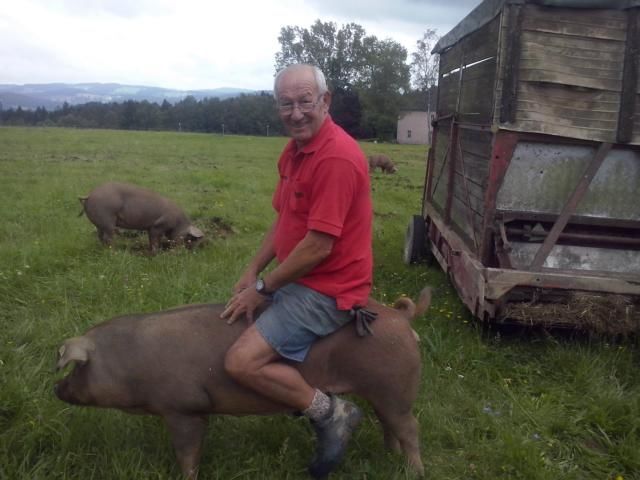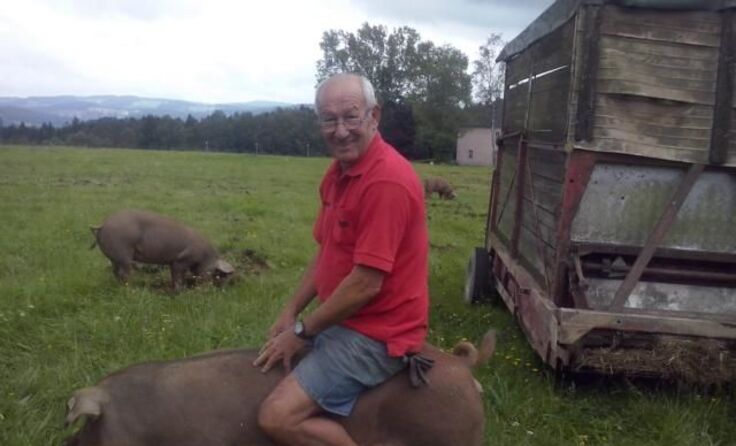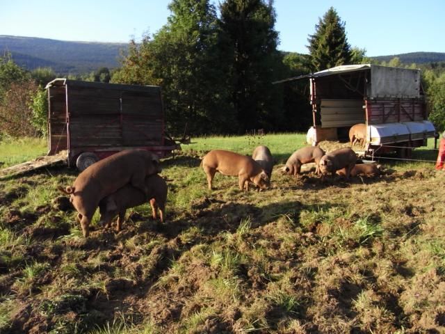 Mit ihren Rüsseln tief in die Erde gegraben wühlen sich die Duroc-Freilandschweine von Biobauer Simon Greiner durch eine abgezäunte Wiese in Panidorf. Was augenscheinlich wie eine ganz normale Schweine-Freilandhaltung ausschaut, ist aber mehr. „Sie sind unsere Engerling-Bekämpfungsmaschinen“, erklärt Greiners Nachbar Franz Zimmerbauer, der mit seiner Frau Hilda die zehn Tiere betreut. Tatsächlich graben die Schweine die komplette Wiese um und fressen alle Engerlinge. „Wir haben nachgesehen, die Tiere sind weg“, sagen die Zimmerbauers. Entdeckt haben sie die Vorliebe der Schweine für die Maikäferlarven, als die Tiere aus ihrem Gatter entfleucht und sich über die Engerlinge in der angrenzenden Wiese hergemacht haben.