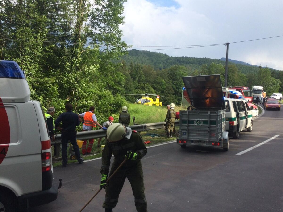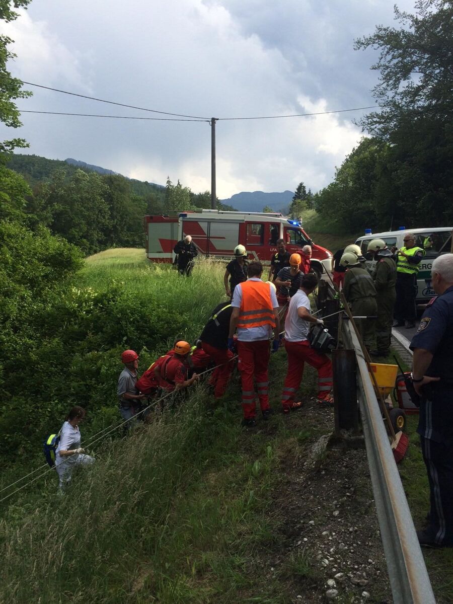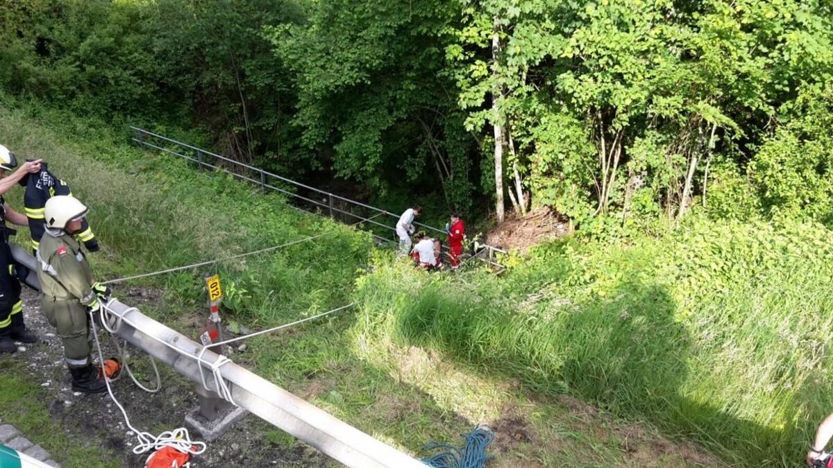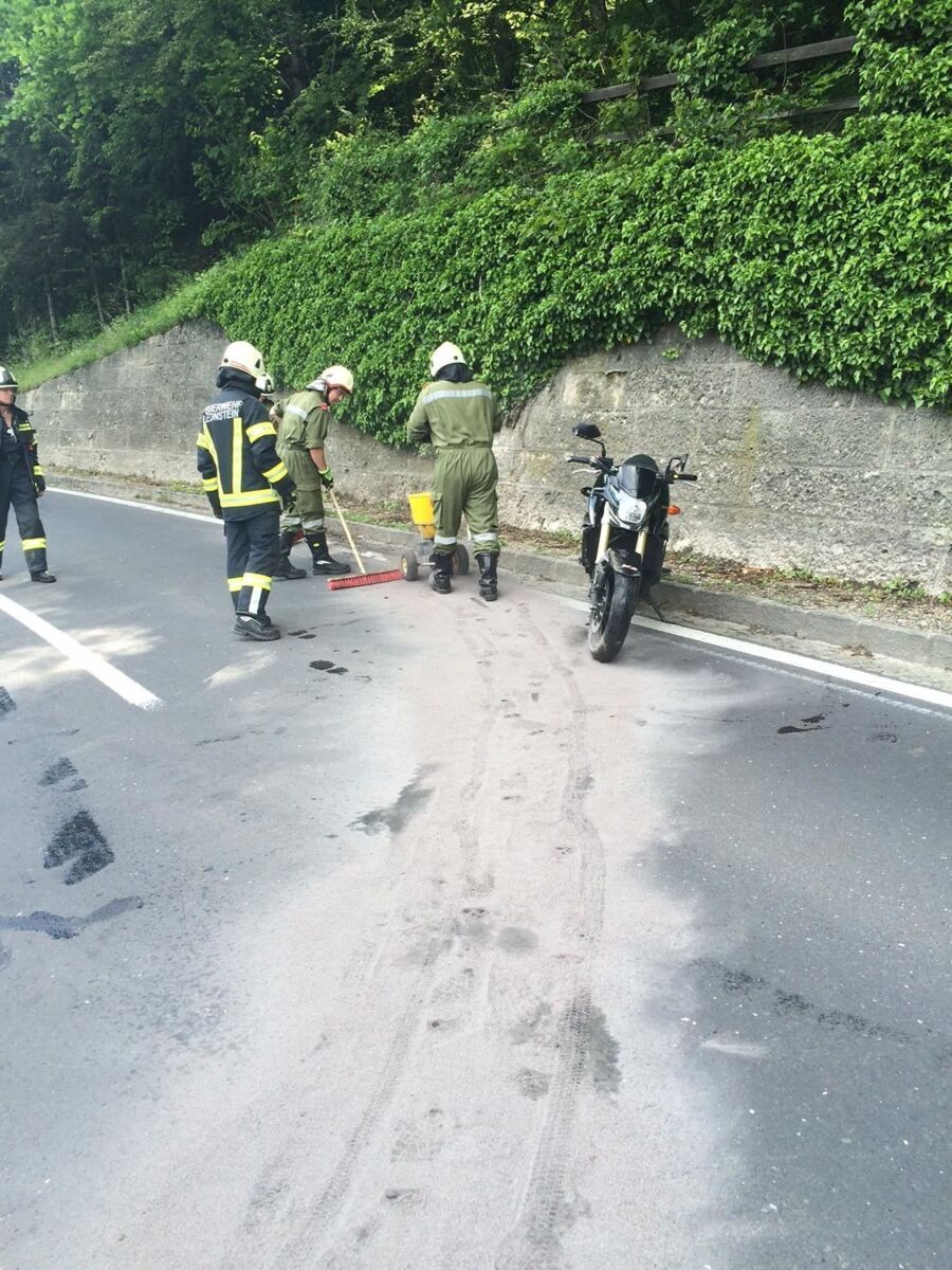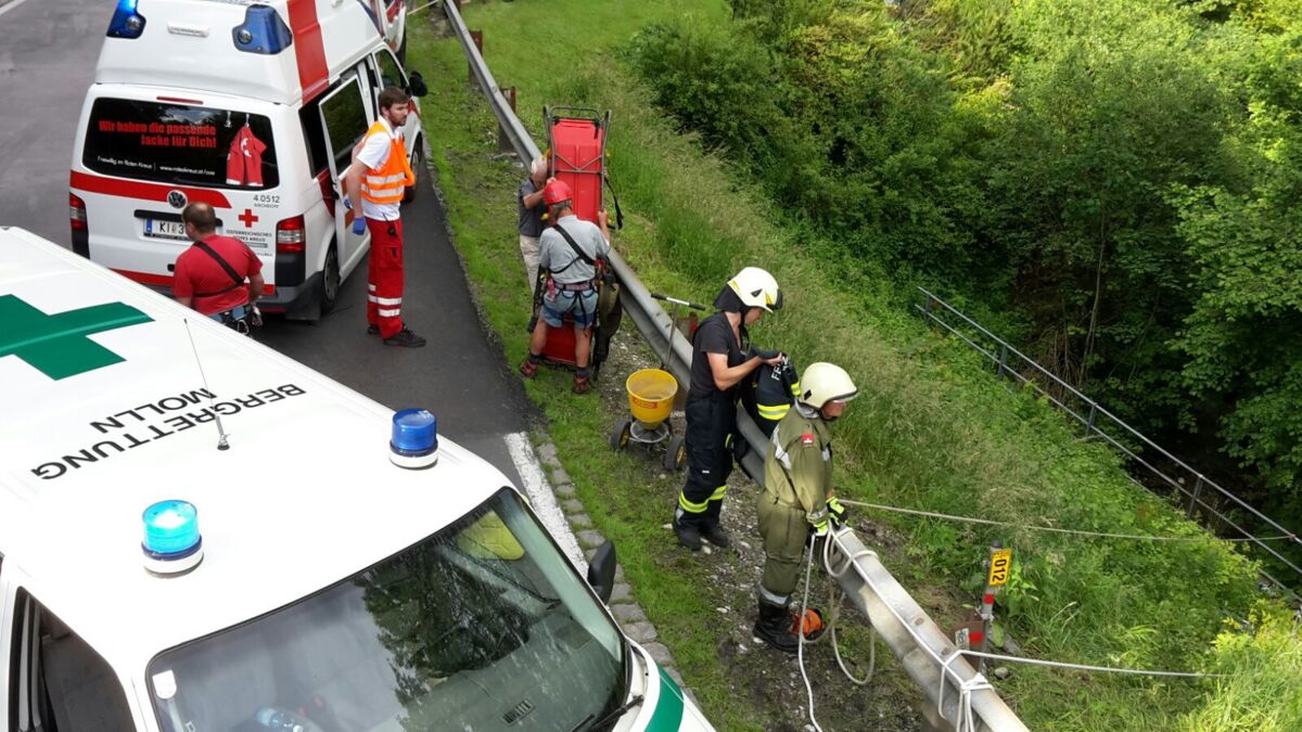 Ein Motorradlenker verlor in einer Linkskurve die Herrschaft über sein Fahrzeug und prallte gegen eine Leitschiene. Der Lenker wurde in weiterer Folge über eine steile Böschung geschleudert, wo er sich in einem Geländer verfing. Beim Eintreffen am Einsatzort wurde ein völlig demoliertes Motorrad vorgefunden, woraus eine größere Menge an Betriebsmittel ausfloss. Die verletzte Person wurde nach der Erstversorgung durch den Notarzt gemeinsam mit der Bergrettung aus dem Straßengraben gerettet und dem Team des Christophorus Notarzthubschraubers übergeben. Die Feuerwehr band das ausgeflossene Betriebsmittel und säuberte die Straße.