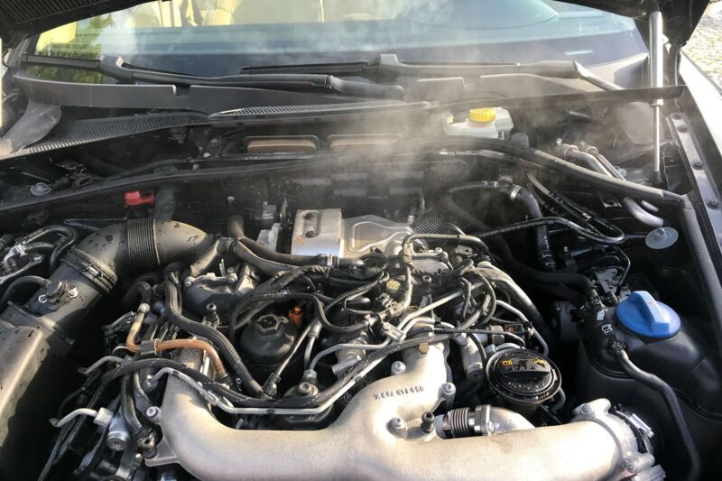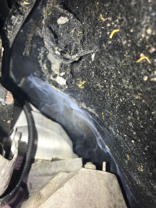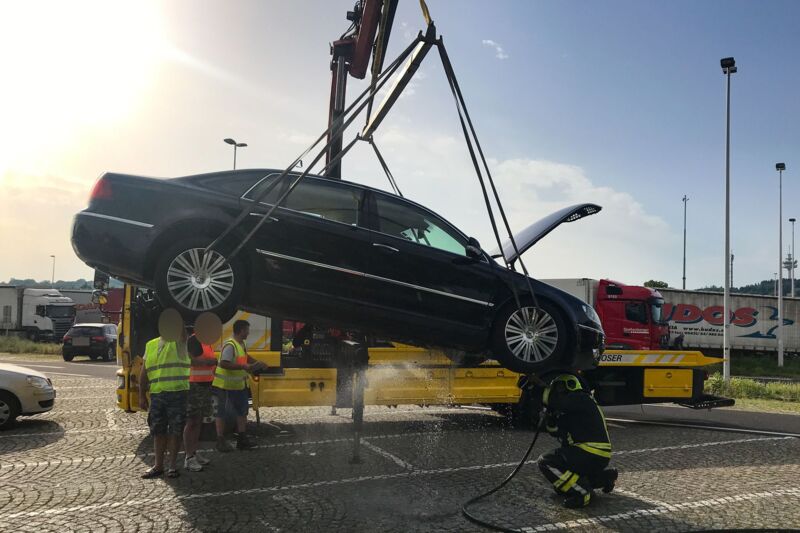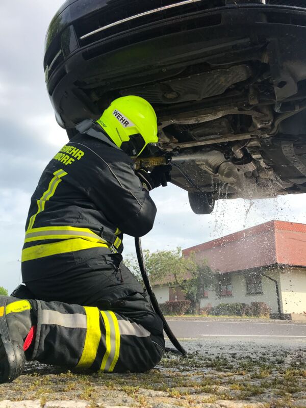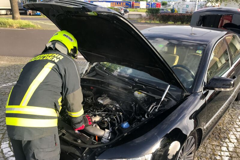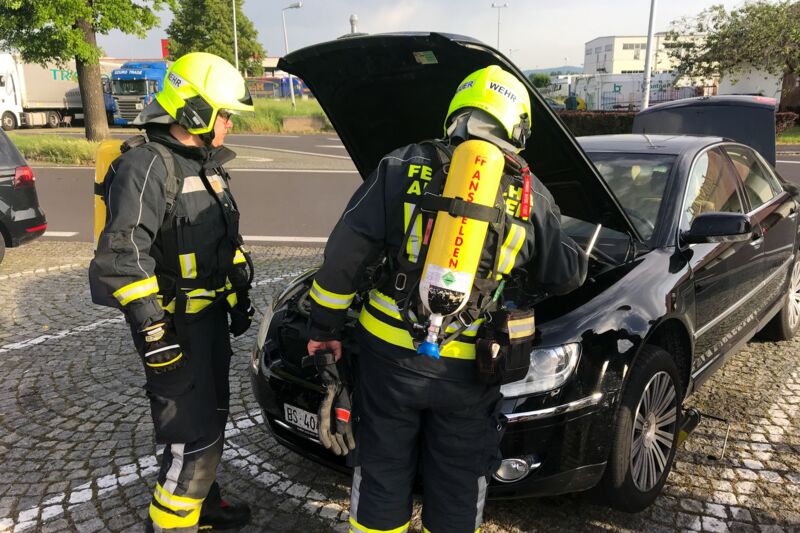 Als die Einsatzkräfte eintrafen, stellten sie eine leichte Rauchentwicklung im Bereich des Motorblocks fest. Da mit einer Wärmebildkamera keine hohe Temperatur festgestellt wurde und auch das Aufbringen mit Löschwasser zu keinem Nachlassen der Rauchentwicklung führte, wurde ein Abschleppdienst gerufen, der das Fahrzeug anhob.