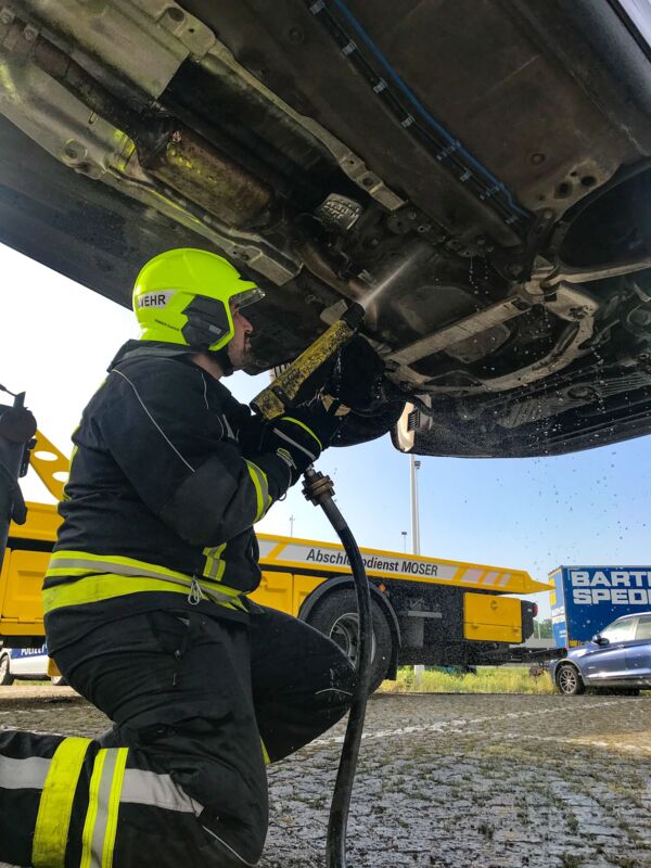Dabei stellte sich glosendes Dämmmaterial am Unterboden als Ursache der Rauchentwicklung heraus. Der Wagen wurde von der Feuerwehr einer ausgiebigen Unterbodenwäsche unterzogen, so konnte der Glimmbrand gelöscht werden. Die Einsatzkräfte konnten nach rund eineinhalb Stunden einrücken.