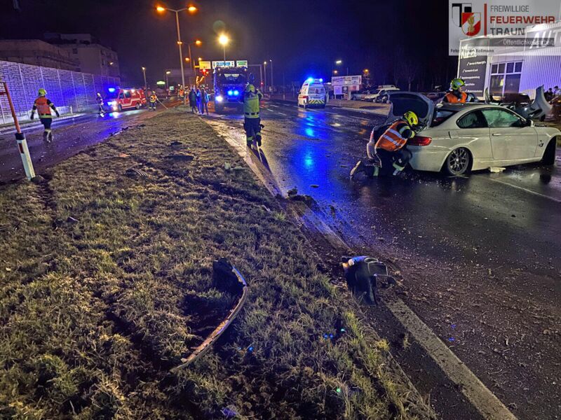 “Zwei Fahrzeuge haben dabei ein wahres Schlachtfeld aus Scherben, Autoteilen und Erde auf beiden Richtungsfahrbahnen hinterlassen. Gemeinsam mit einer angeforderten Kehrmaschine mussten die Einsatzkräfte die Fahrbahnen in einer zweistündigen mühsamen Aktion freimachen bzw. reinigen. Im Einsatz standen auch die Polizei und das Rotes Kreuz Traun. Trotz der späten Tageszeit kam es rasch zu umfangreichen Verkehrsbehinderungen und einem regen Zustrom an Schaulustigen“, berichtet die Freiwillige Feuerwehr Traun.