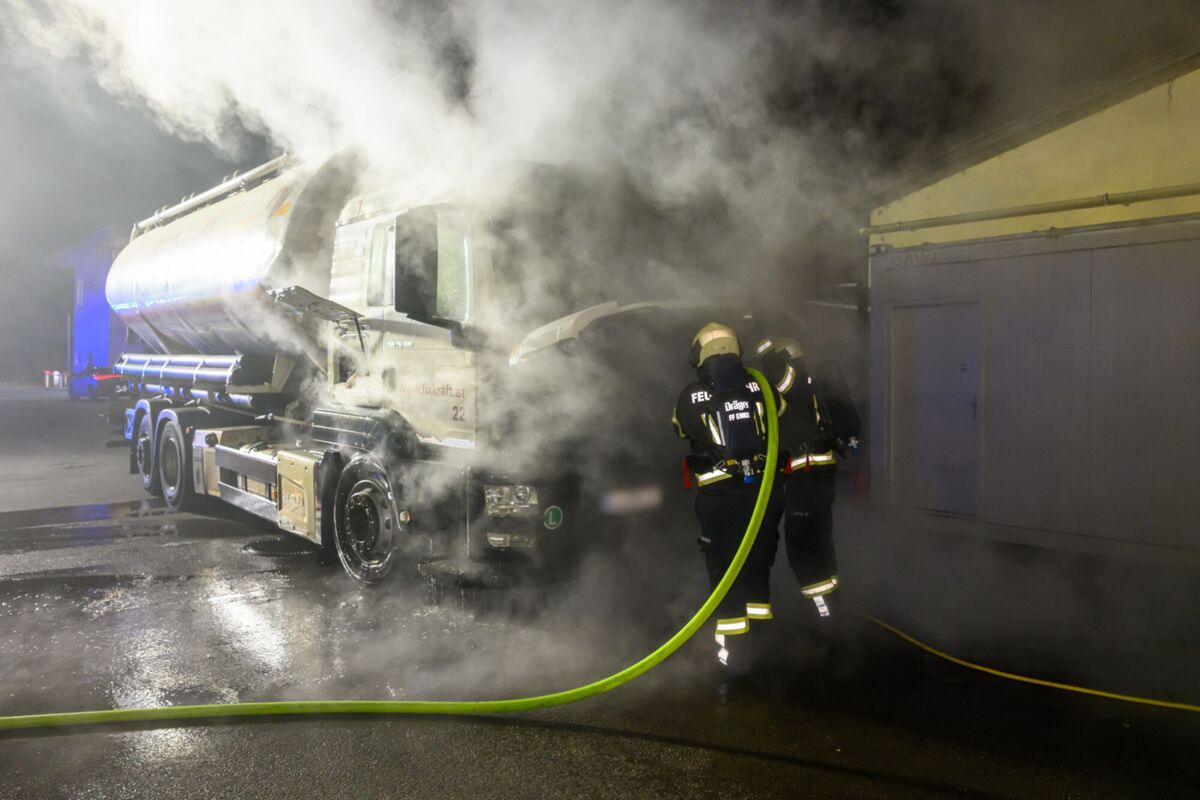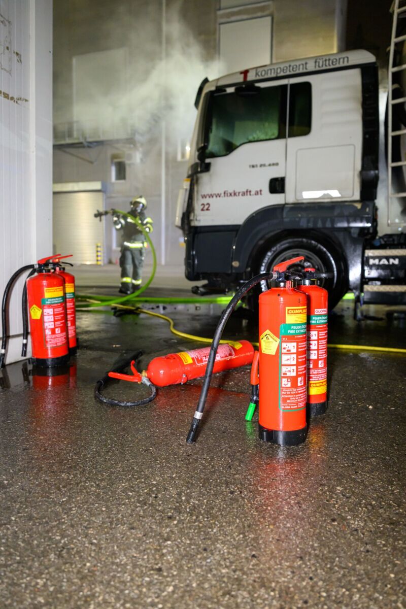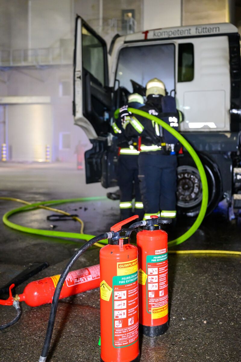 Gegen 5 Uhr bemerkte der Fahrer beim Starten seines Lastwagens Brandgeruch und Flammen im Bereich des Motorblocks. Geistesgegenwärtig stellte er das Fahrzeug sofort ab und griff zum Feuerlöscher, um die ersten Löschmaßnahmen einzuleiten.