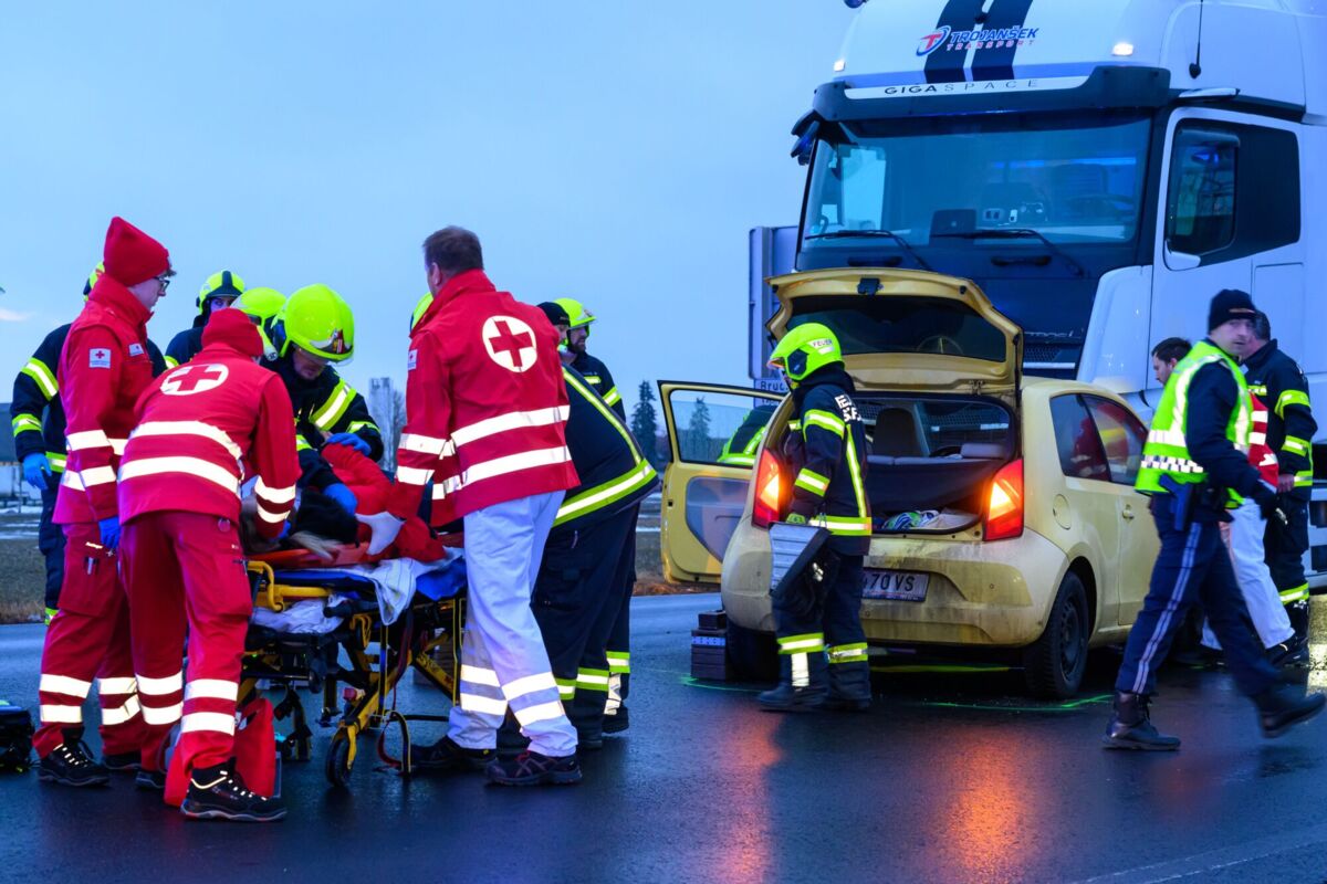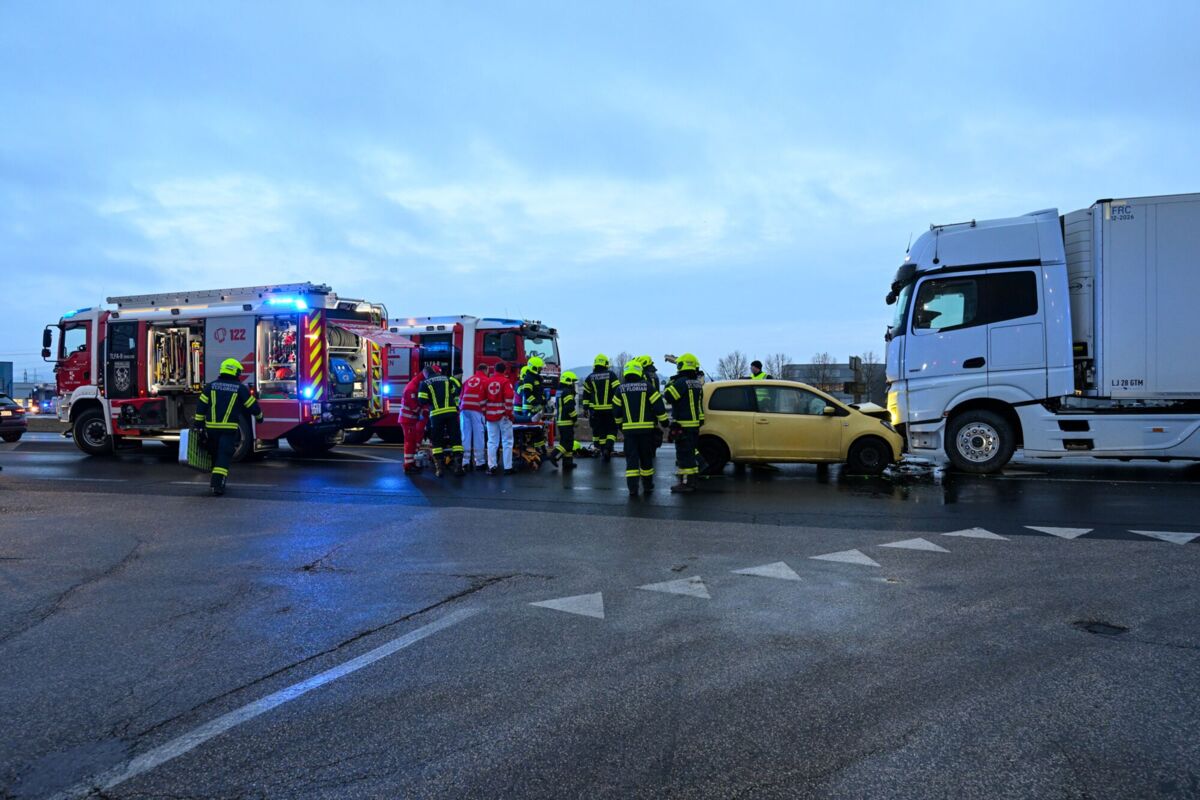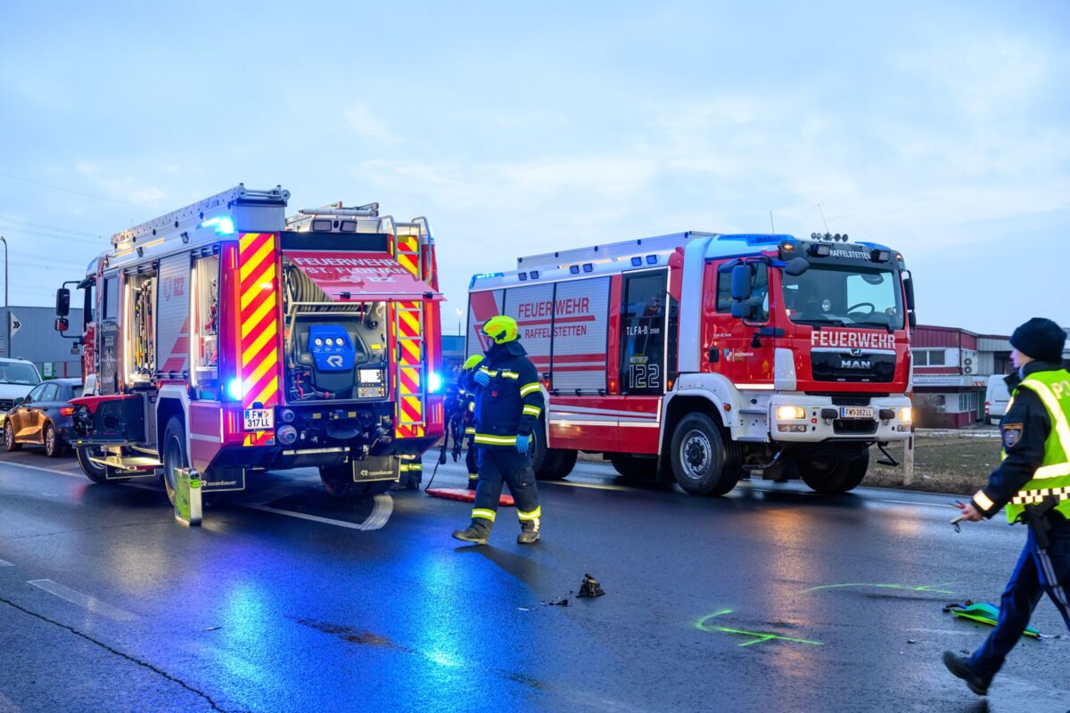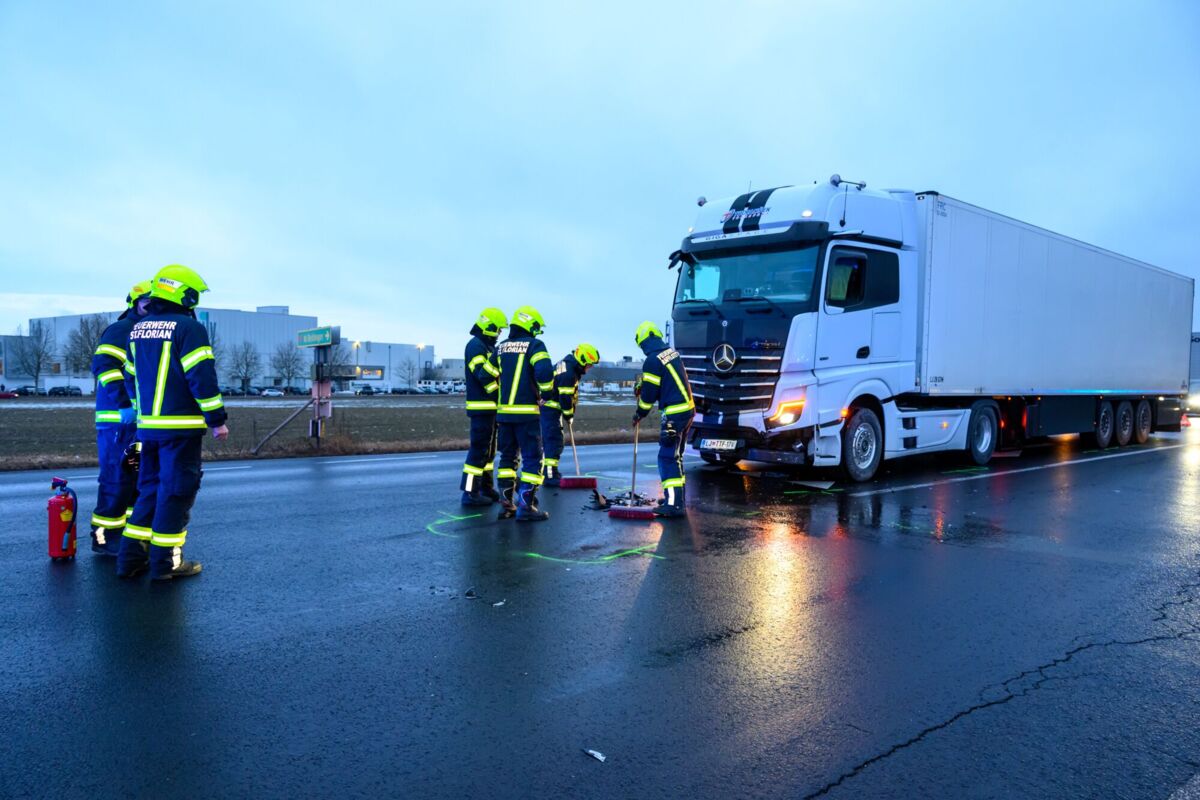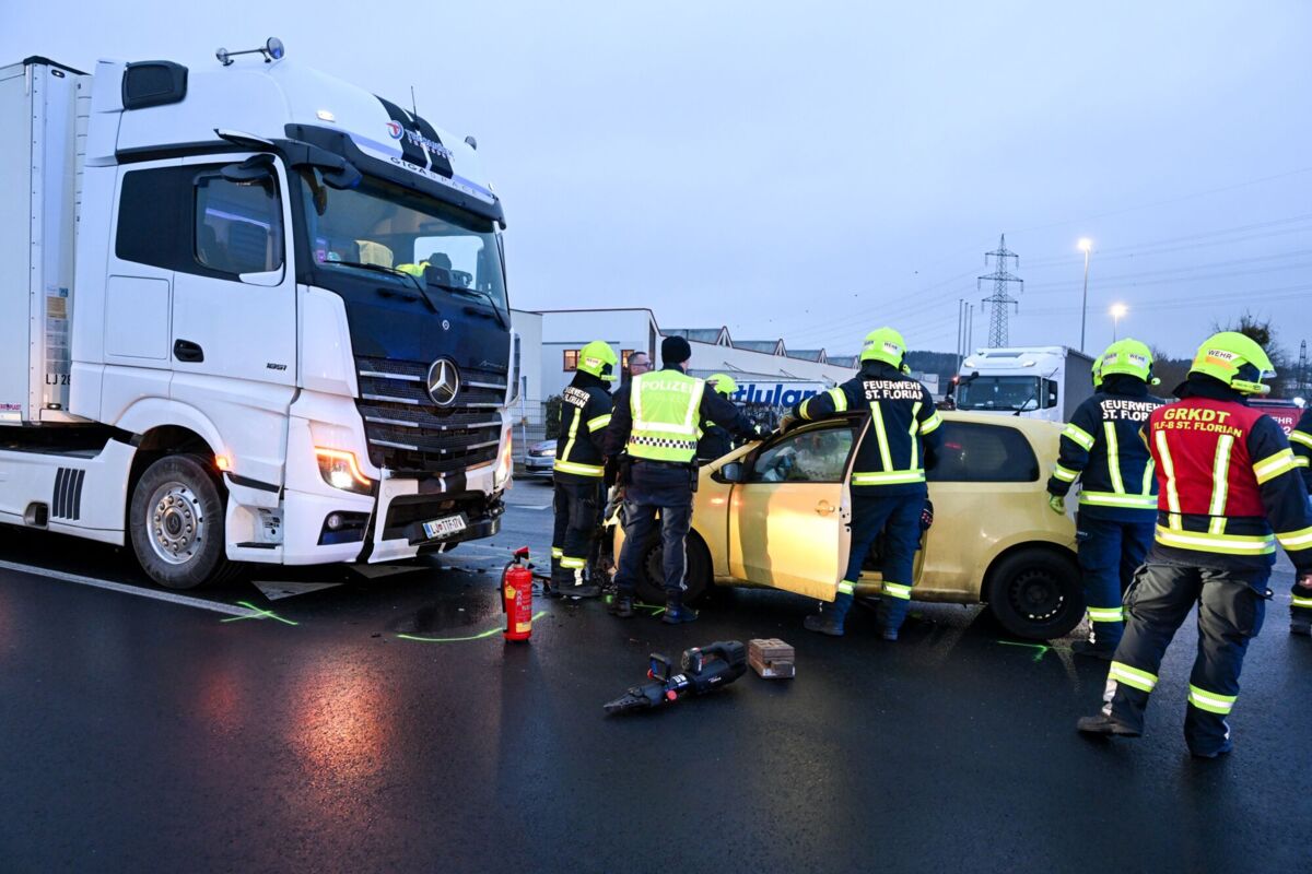 Während die Einsatzkräfte noch mit der Abklärung beschäftigt waren, ereignete sich direkt im Kreuzungsbereich des Firmengeländes an der B1 (Wiener Straße) ein Verkehrsunfall zwischen einem Pkw und einem Lastkraftwagen. Die Lenkerin des Pkw wurde dabei im Fahrzeug eingeschlossen.