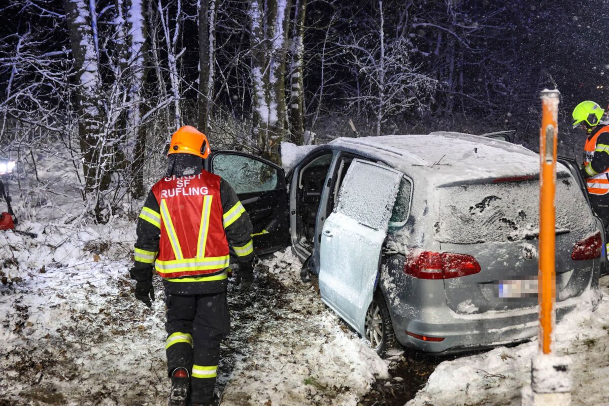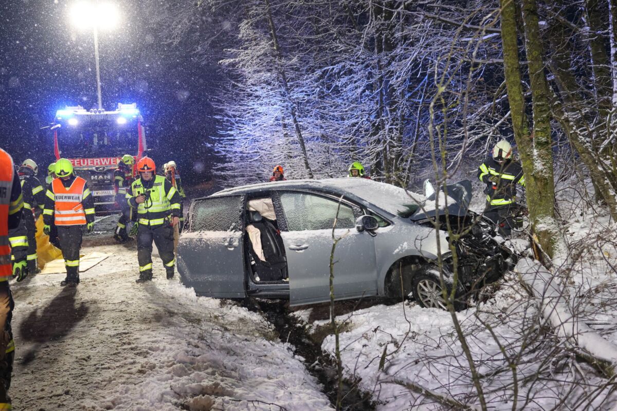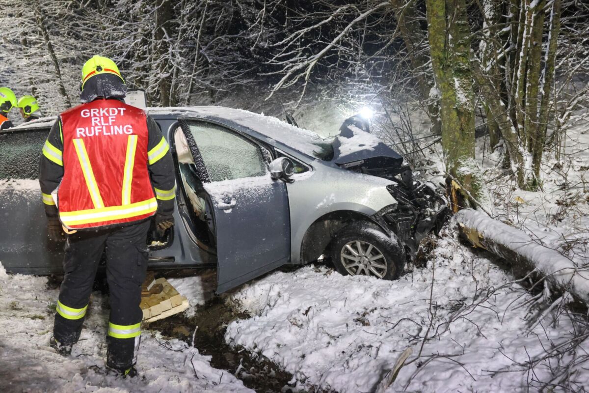 Die Einsatzkräfte von drei Feuerwehren, Rettung, Notarzt und Polizei wurden Freitagfrüh auf die L1388 Ruflinger Straße, Hitzinger Straße, ins Gemeindegebiet von Wilhering alarmiert. Ein Auto ist dort bei winterlichen Straßenverhältnissen offensichtlich links von der Fahrbahn abgekommen und frontal gegen einen Baum gekracht.