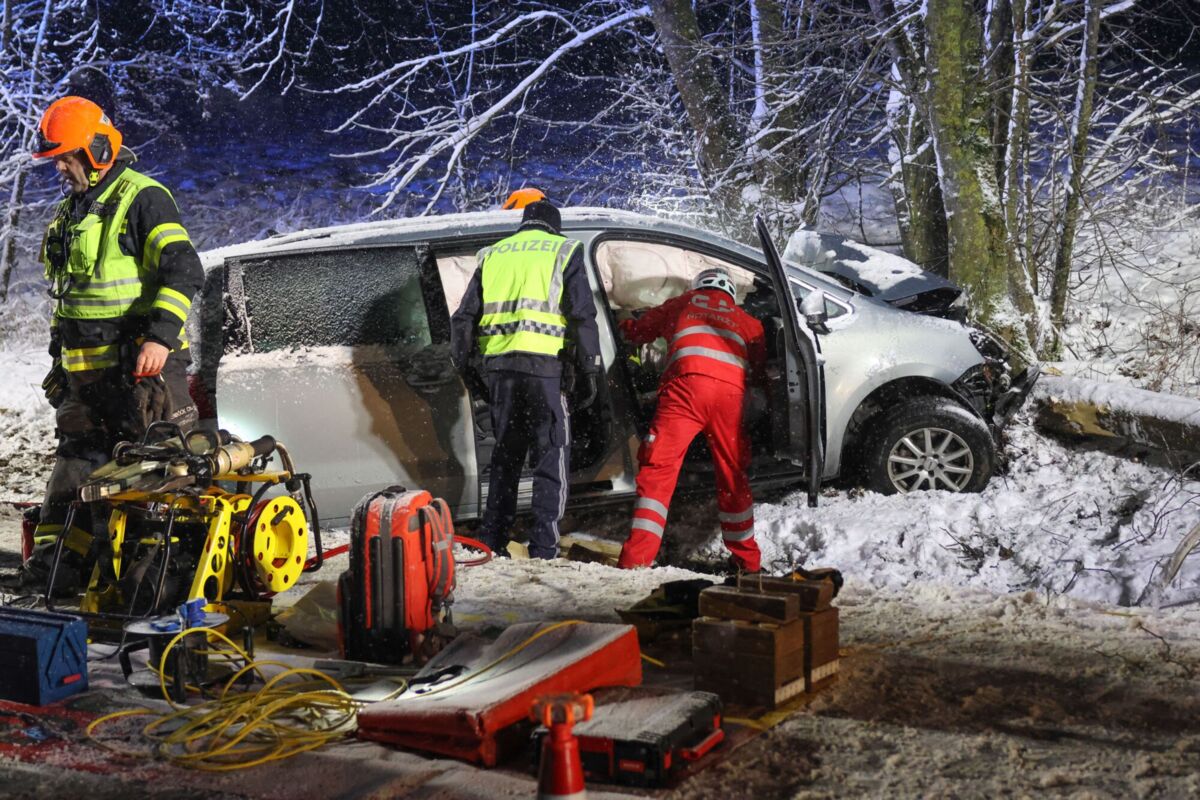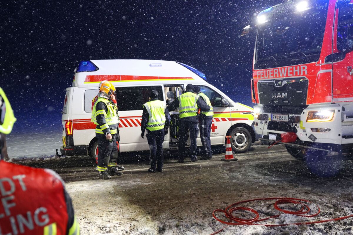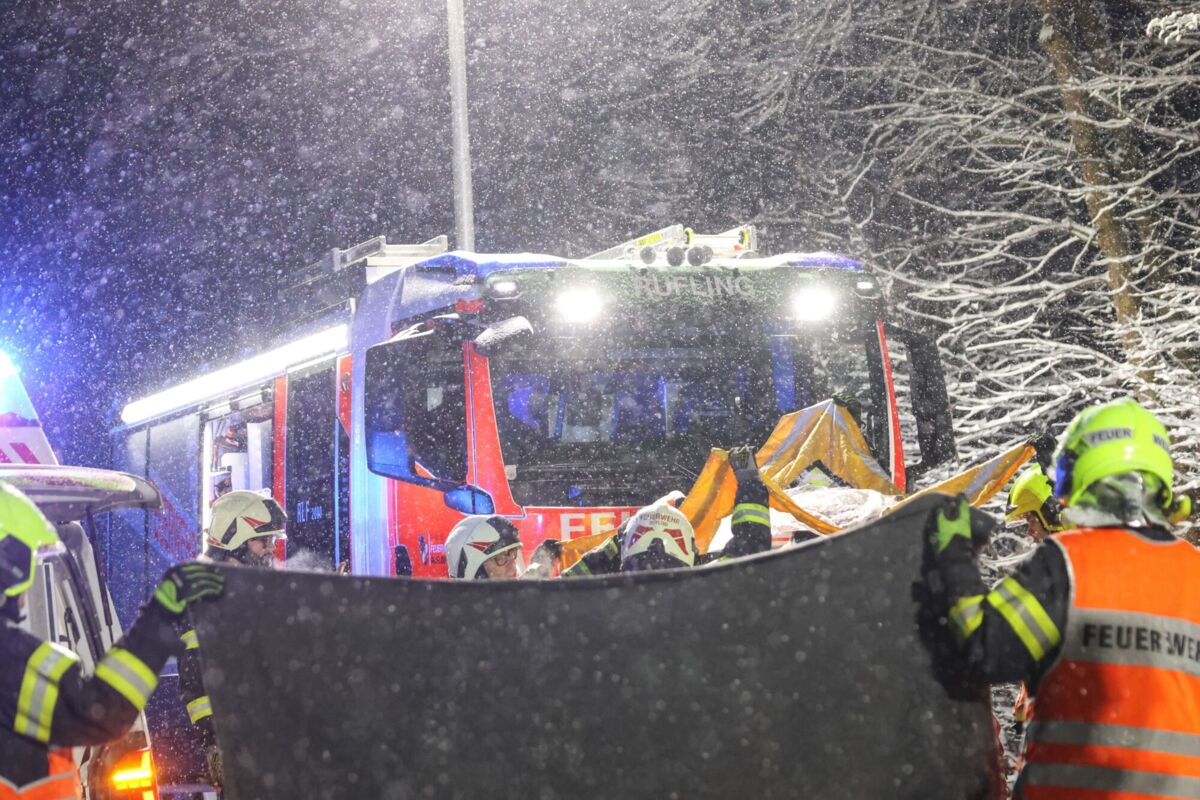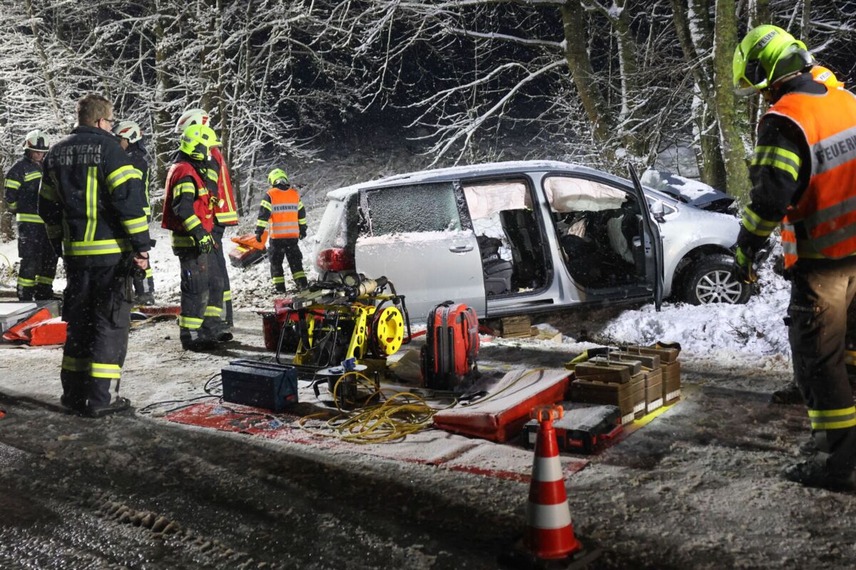 Die Einsatzkräfte von drei Feuerwehren, Rettung, Notarzt und Polizei wurden Freitagfrüh auf die L1388 Ruflinger Straße, Hitzinger Straße, ins Gemeindegebiet von Wilhering alarmiert. Ein Auto ist dort bei winterlichen Straßenverhältnissen offensichtlich links von der Fahrbahn abgekommen und frontal gegen einen Baum gekracht.