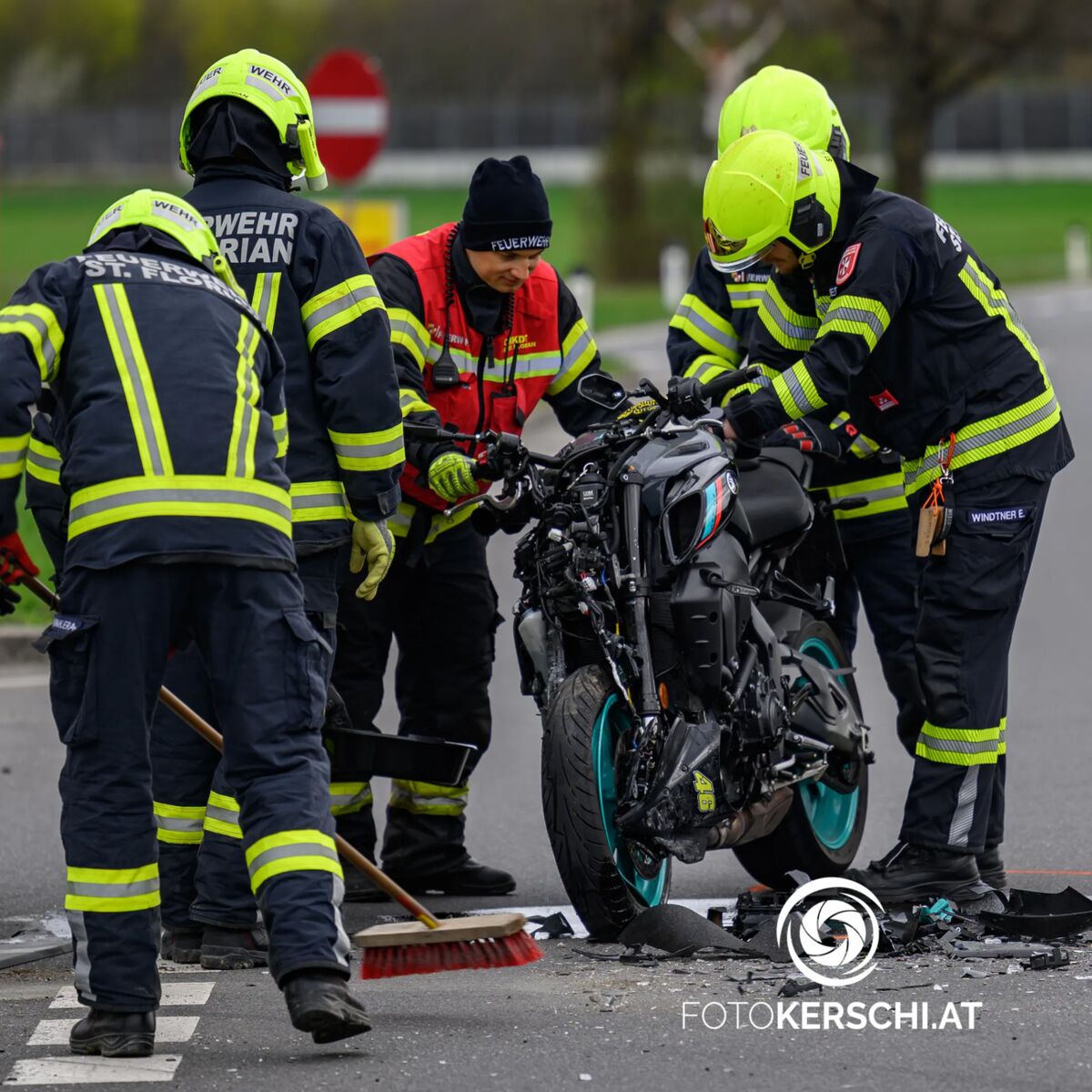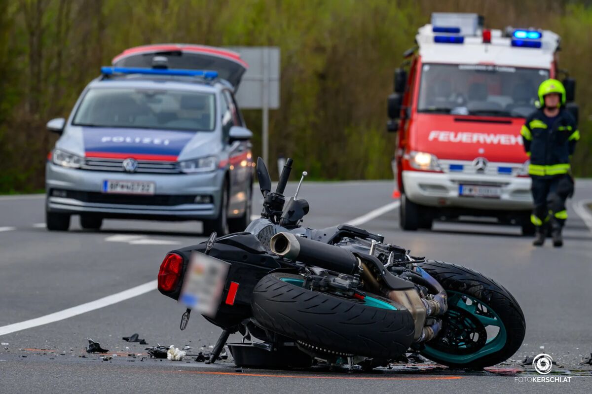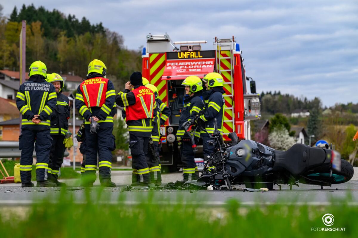 Die Freiwillige Feuerwehr St. Florian-Markt wurde gegen 8.24 Uhr zu dem Unfall alarmiert. Beim Eintreffen fanden die Einsatzkräfte ein stark beschädigtes Motorrad auf der Fahrbahn vor, der beteiligte Kleintransporter wies deutliche Schäden an der rechten Seite auf. Trümmerteile waren über die Straße verstreut.