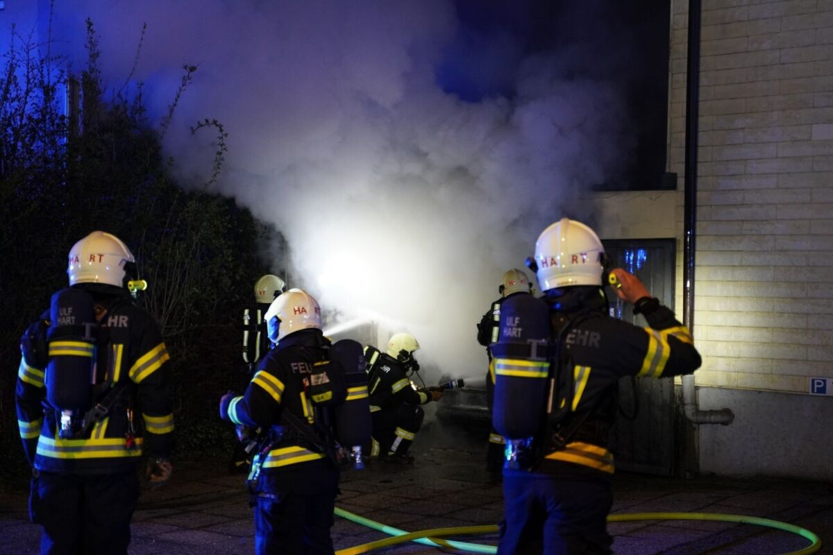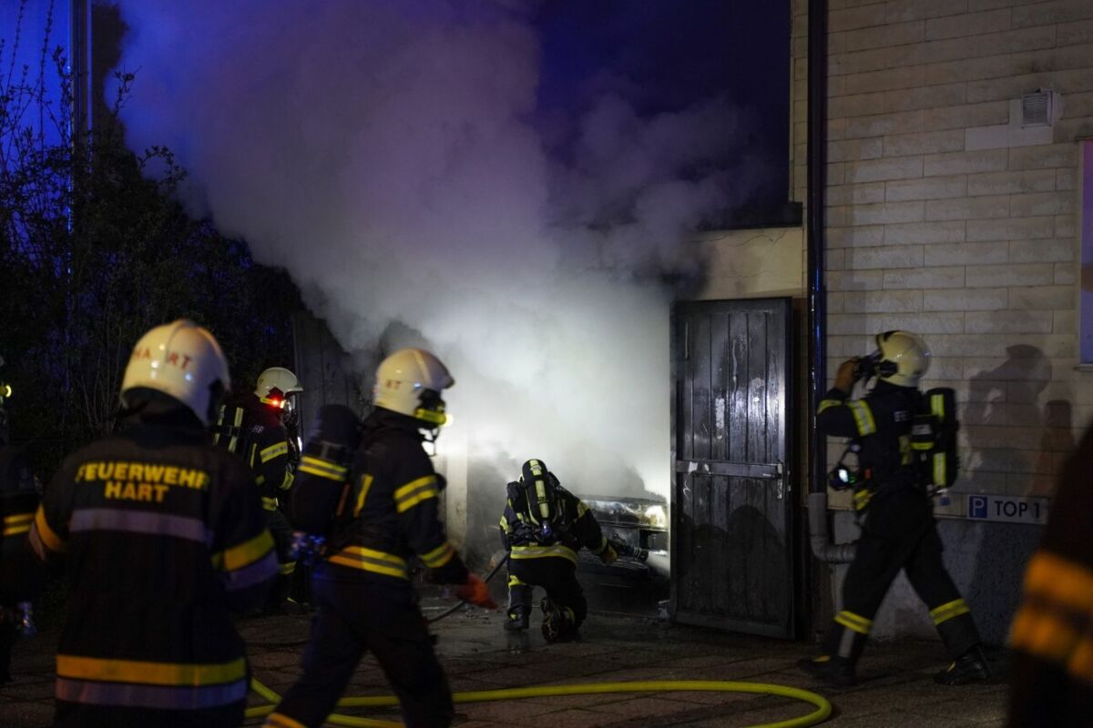 Garage bei Mehrparteienhaus in Leonding in Vollbrand