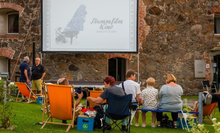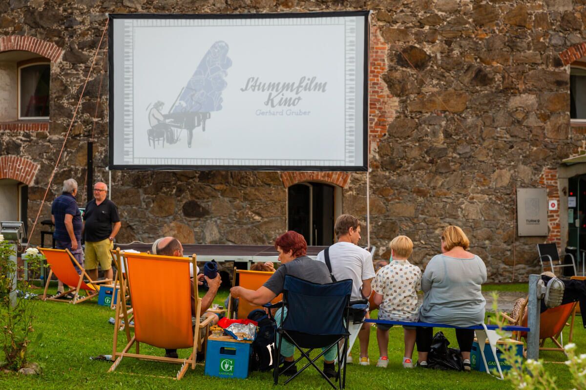 Gerhard Gruber begleitet seit 1988 weltweit Filme als Stummfilmpianist. Seine Begeisterung für dieses Metier ist seither ungebrochen. Sein Zugang zur Stummfilmbegleitung ist die Improvisation, die er als direkten und immer neuen Dialog mit dem Geschehen auf der Leinwand ansieht. Nähere Infos gibt es auf www.kuva.at. Bei Schlechtwetter findet das Stummfilmkino im wunderschönen Dachgeschoss im Turm statt.