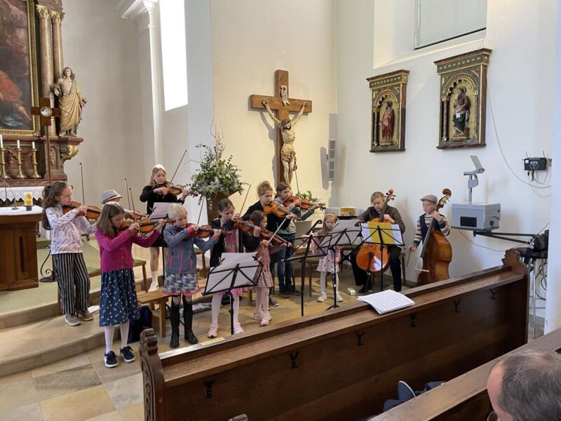 Die musikalischen und bildnerischen Ergebnisse, die im Workshop erarbeitet wurden, wurden dann am Sonntag nach dem Gottesdienst, der von Streichern der LMS Neuhofen/Krems unter der Leitung von Susanna Aigner-Haslinger gestaltet wurde, im Pfarrhof Ansfelden präsentiert.