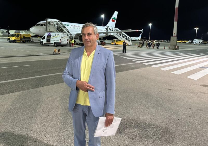 Während am Himmel das Abendrot leuchtete, las der deutsch-russische Bestseller-Autor Wladimir Kaminer im Scheinwerferlicht der Flugzeug-Kabine aus seinem neuen Band „Frühstück am Rande der Apokalypse“.
