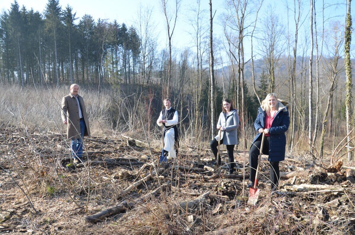 Das macht etwa 300 frisch gepflanzte Bäume für die Neugeborenen Leondinger und 40 Bäume für junge Wilheringer. Gemeinsam mit Abt Reinhold Dessl und Förster Manfred Feichtinger pflanzten Sabine Naderer-Jelinek und Christina Mühlböck am Montag die ersten Ahornbäumchen im Kürnbergwald.
