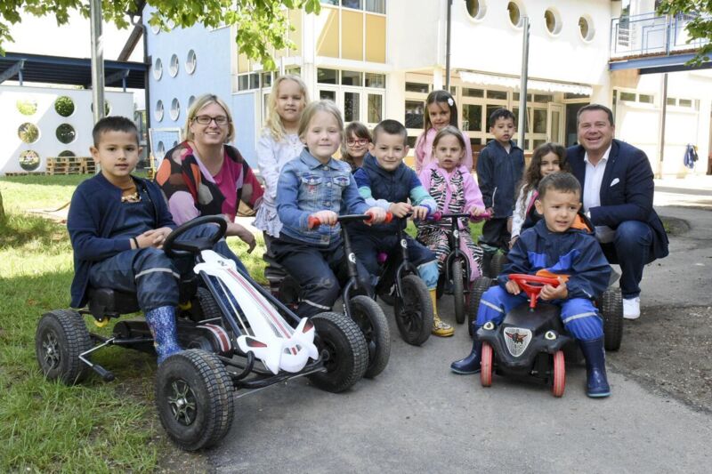 Bewegung an der frischen Luft tut Alt und Jung gut. Die großen Gärten der Kindergartenhäuser in der Stadtgemeinde bieten dazu abwechslungsreiche Möglichkeiten für die jüngsten Ansfeldner. Der neue Rollerweg sorgt für weniger Gatsch auf der schon bisher bei den Kindern beliebten Laufstrecke in der Wiese und dafür für mehr Roll-, Rutsch- und Radlspaß. Groß war die Freude als Bürgermeister Christian Partoll die zehn dazu neu angeschafften Laufräder, Go-Karts und Rutschautos für die Kleinsten übergeben hat. In den kommenden Wochen wird ein ähnlicher Rollerweg auch für den Kindergarten Haid I in der Salzburger Straße fertiggestellt werden.