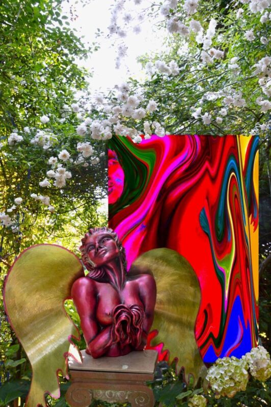 Bei dieser Ausstellung verbindet sich die Realität, die sich im Garten der Engel mit ihrer natürlichen Schönheit präsentiert, mit der digitalen Welt und verschmilzt zu einem künstlerischen Dialog der besonderen Art. Realistische Skulpturen, die sich im Rosen-Dschungel, umhüllt von Farnen und Hortensien, dem Betrachter zuwenden, verwandeln sich im Atelier zu farbenfroher, lebendiger und lebensbejahender, digitaler Kunst ohne jegliche Gegenständlichkeit. Die Natur verbindet sie zu einem homogenen Ganzen.