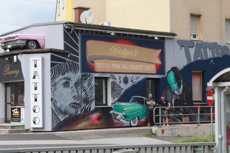 Entstanden ist die Verschönerung der Außenwände des Tatoo-Studios aber ganz zufällig. Graffiti-Künstler Tobias Tomasek aus Linz war gerade an einem anderen Projekt beschäftigt, als ihm dessen Arbeit aufgefallen war. „Da ist Martin, der Besitzer vom Bodycult, zufällig vorbeigefahren und hat mich sofort angequatscht, weil ihm meine Bilder so gut gefallen. So ist es zustande gekommen, dass wir uns zusammengesetzt haben. Ich habe einen Entwurf gemacht und der ist in den nächsten Wochen gemeinsam immer wieder weiterentwickelt worden, bis es jetzt endlich zur Umsetzung gekommen ist“, erzählt Tomasek.