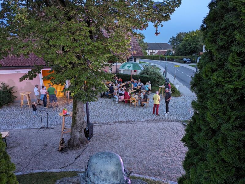 Die Platzierung der großen Friedensbilder um das Kriegerdenkmal lenkte die Gedanken auch an die vielen Todesopfer der beiden Weltkriege. Die von Projektleiter Siegfried Hehenberger in den Raum gestellte Frage: „Was würden uns diese vielen Toten heute erzählen, über welche Gefahren würden sie uns wohl warnen?“, machte an diesem Abend das Kriegerdenkmal zu einem Mahnmal. Die gestalteten Kunstobjekte wurden von der Bevölkerung interessiert bestaunt. Der Umstand, dass nur alte Dinge verwendet wurden, die teilweise aus dem Sperrmüll gerettet wurden, bewies praktizierte Nachhaltigkeit.