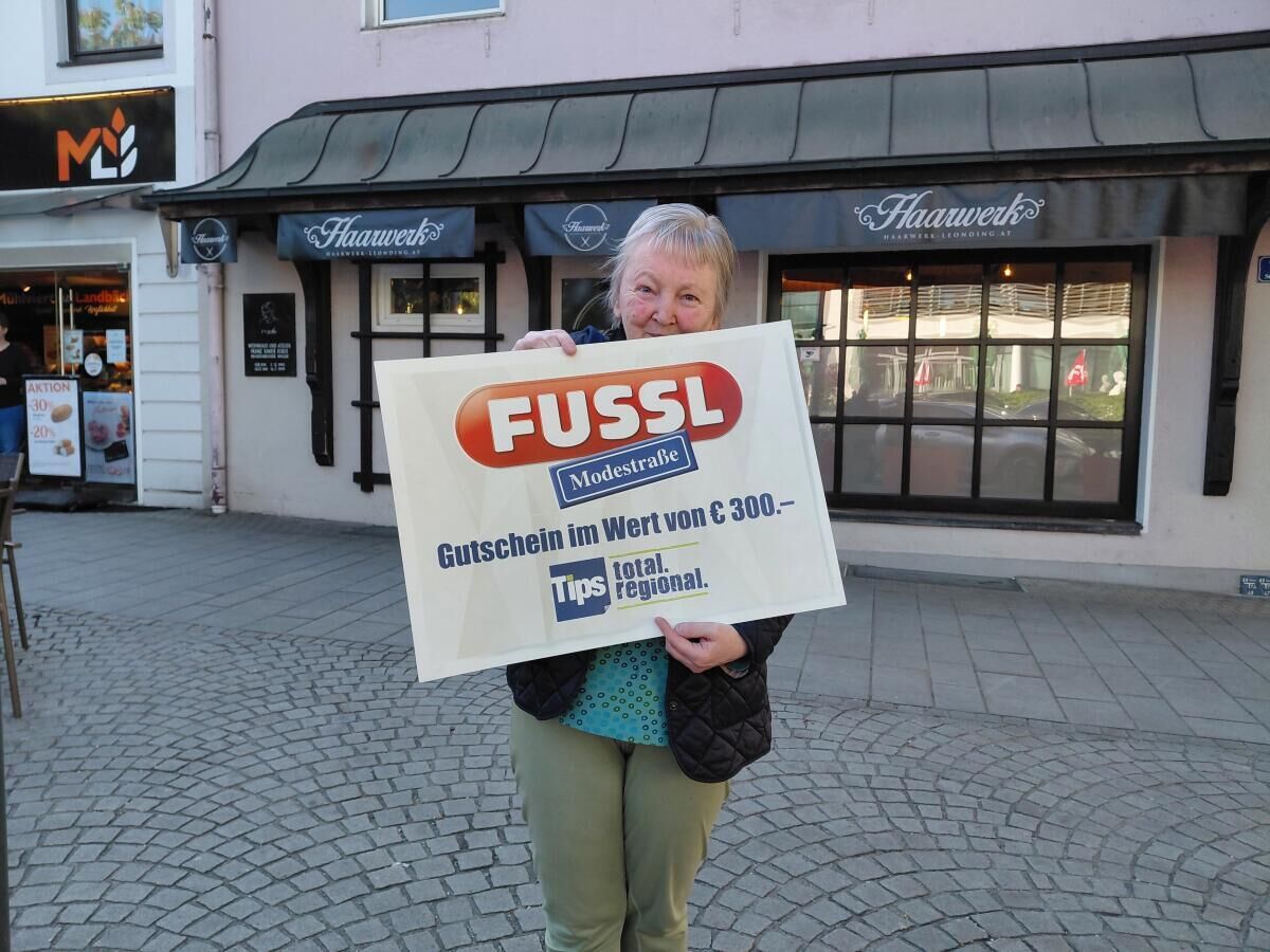 Am Leondinger Stadtplatz hatte Claudia Ruhmanseder die richtige Antwort auf die Frage nach ihrer Lieblingszeitung parat: „Die Tips“, und schon wechselte der Gutschein über 300 Euro den Besitzer. Auch wer das Glücksengerl nicht auf der Straße trifft, kann gewinnen: Tips verlost online auf www.tips.at einen Gutschein der Fussl Modestraße im Wert von 100 Euro.